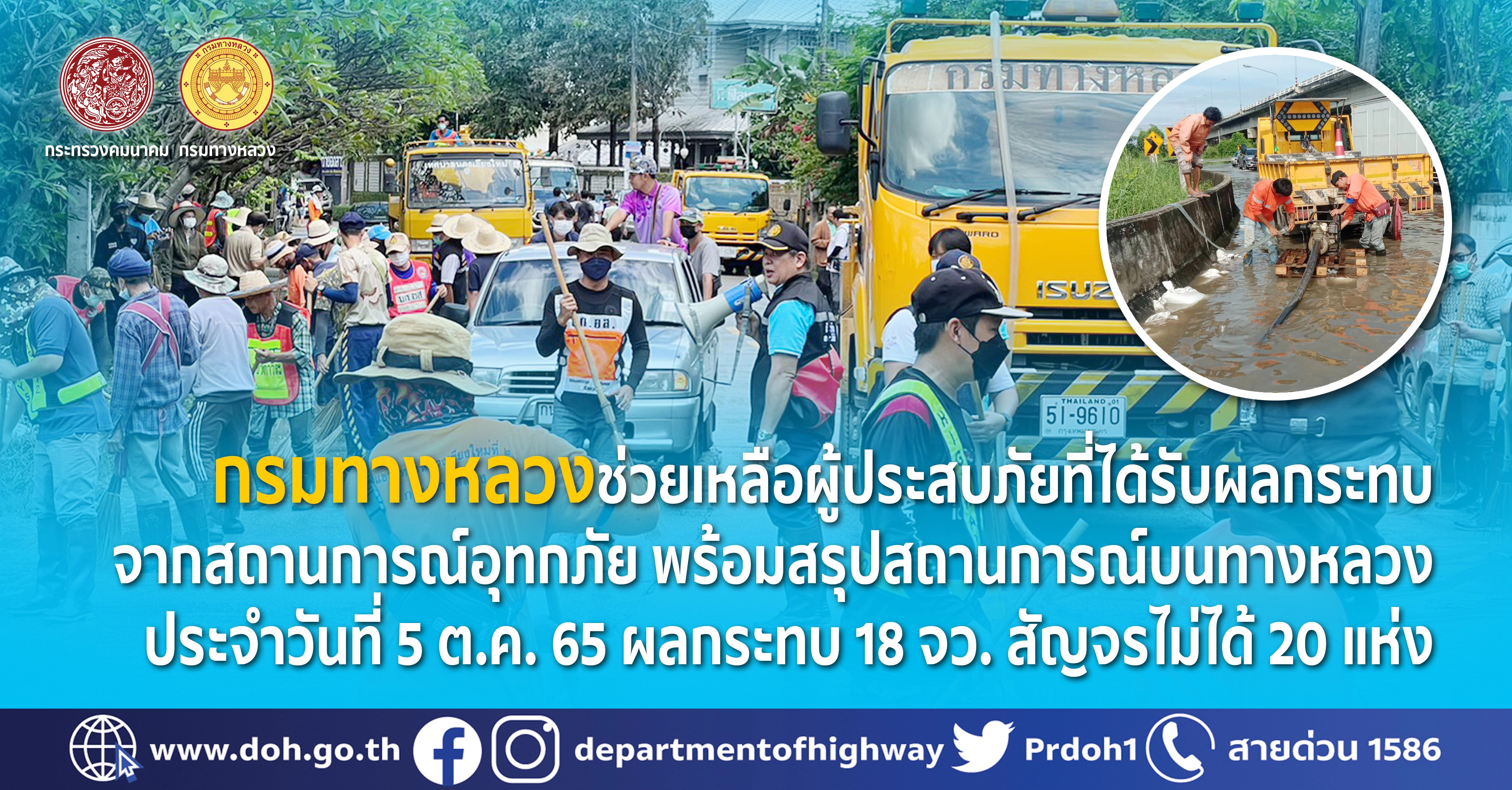 กรมทางหลวงช่วยเหลือผู้ประสบภัยที่ได้รับผลกระทบจากสถานการณ์อุทกภัย พร้อมสรุปสถานการณ์บนทางหลวง ประจำวันที่ 5 ต.ค. 65 ผลกระทบ 18 จว. สัญจรไม่ได้ 20 แห่ง