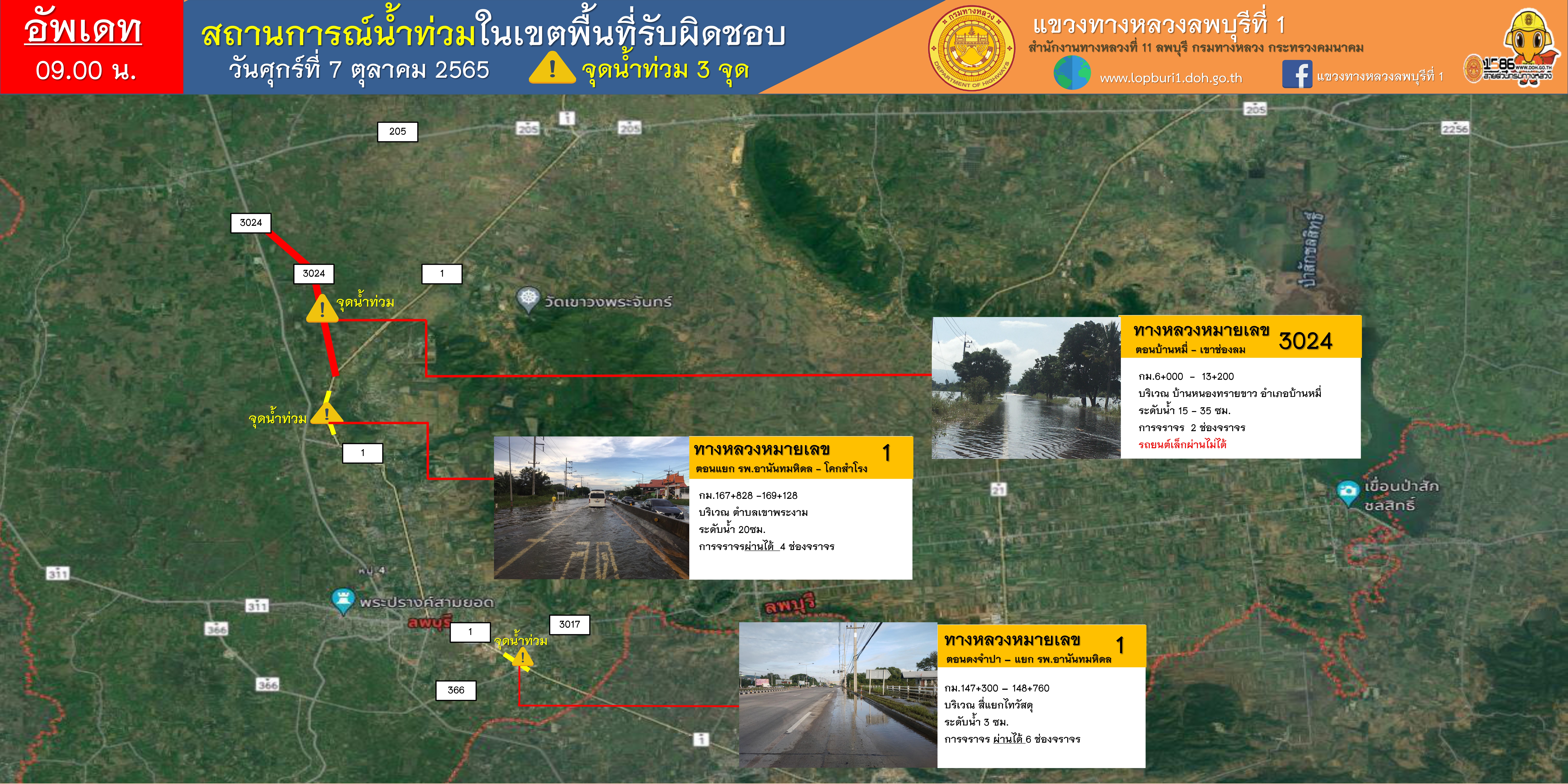 รายงานสถานการณ์อุทกภัยแขวงทางหลวงลพบุรีที่ 1 ข้อมูล ณ วันที่ 7 ตุลาคม 2565