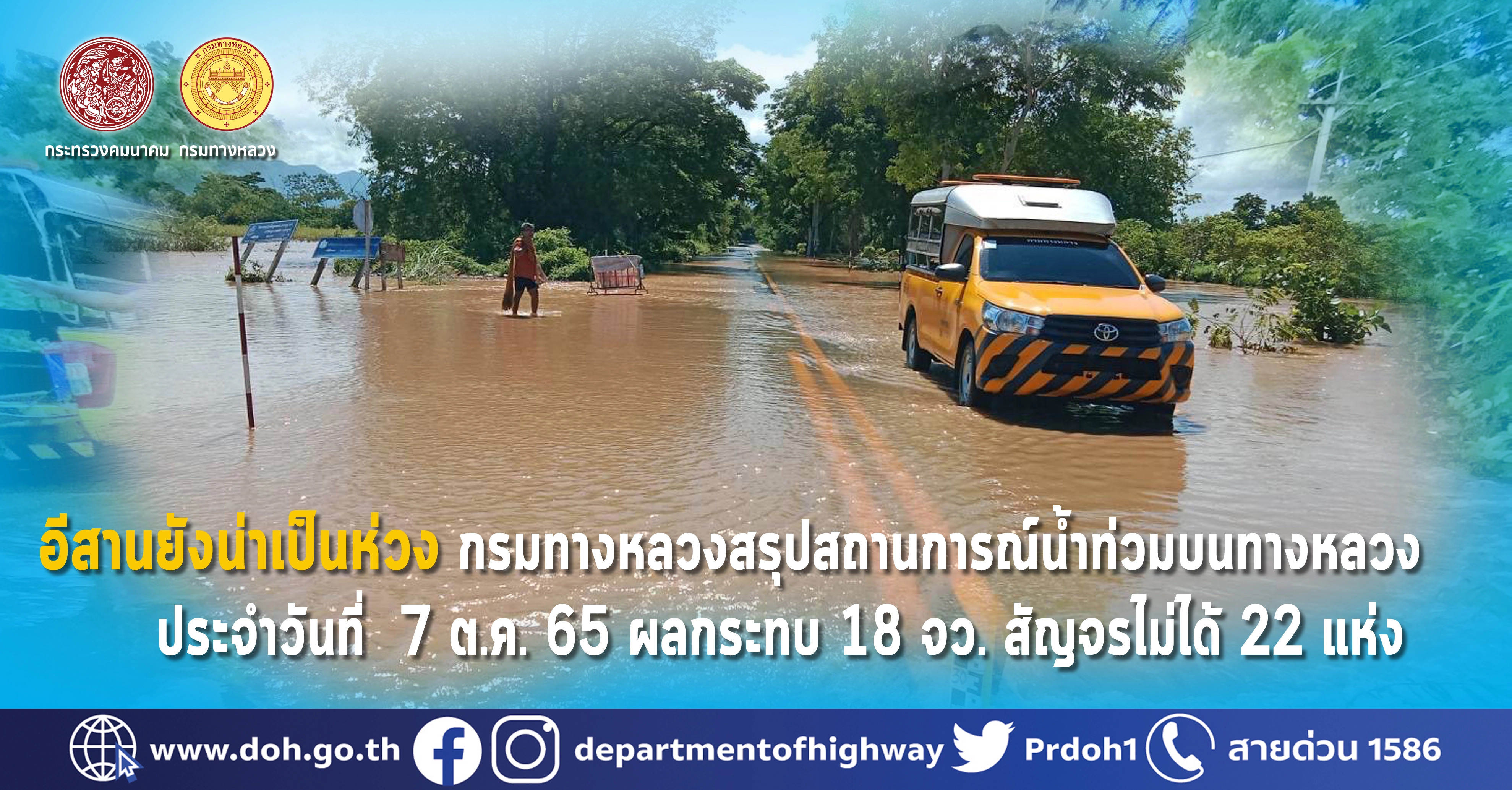 อีสานยังน่าเป็นห่วง กรมทางหลวงสรุปสถานการณ์น้ำท่วมบนทางหลวง ประจำวันที่ 7 ต.ค. 65 ผลกระทบ 18 จว. สัญจรไม่ได้ 22 แห่ง