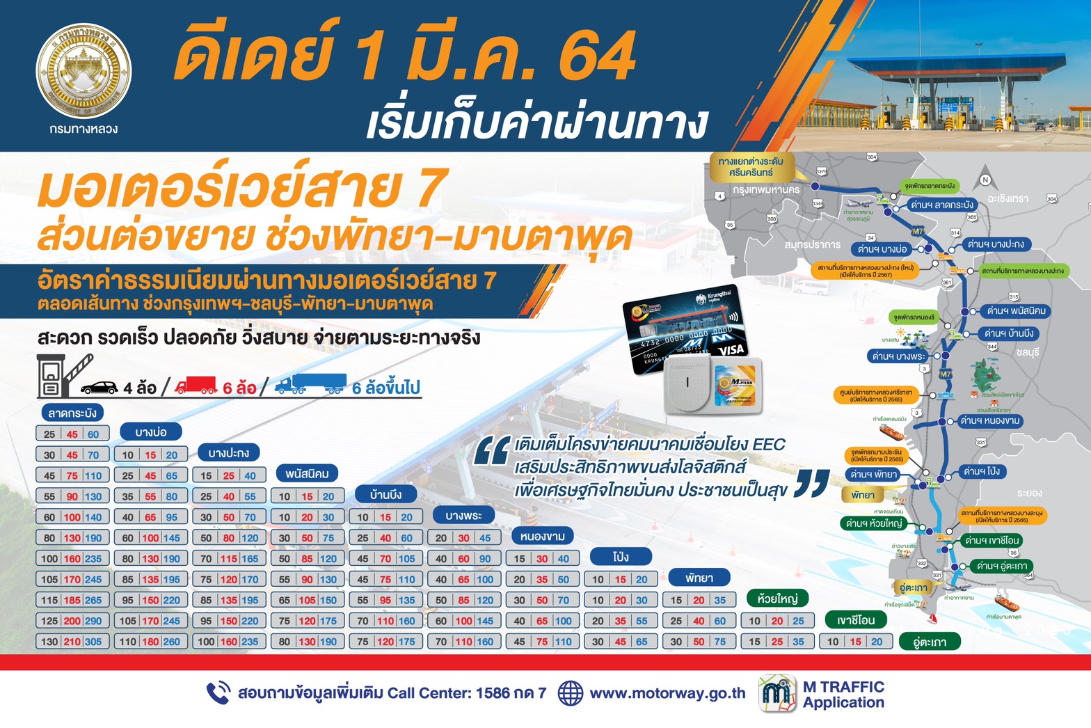 ดีเดย์ 1 มี.ค. 64 เริ่มเก็บค่าผานทางมอเตอร์เวย์สาย 7 ส่วนต่อขยาย ช่วงพัทยา-มาบตาพุด