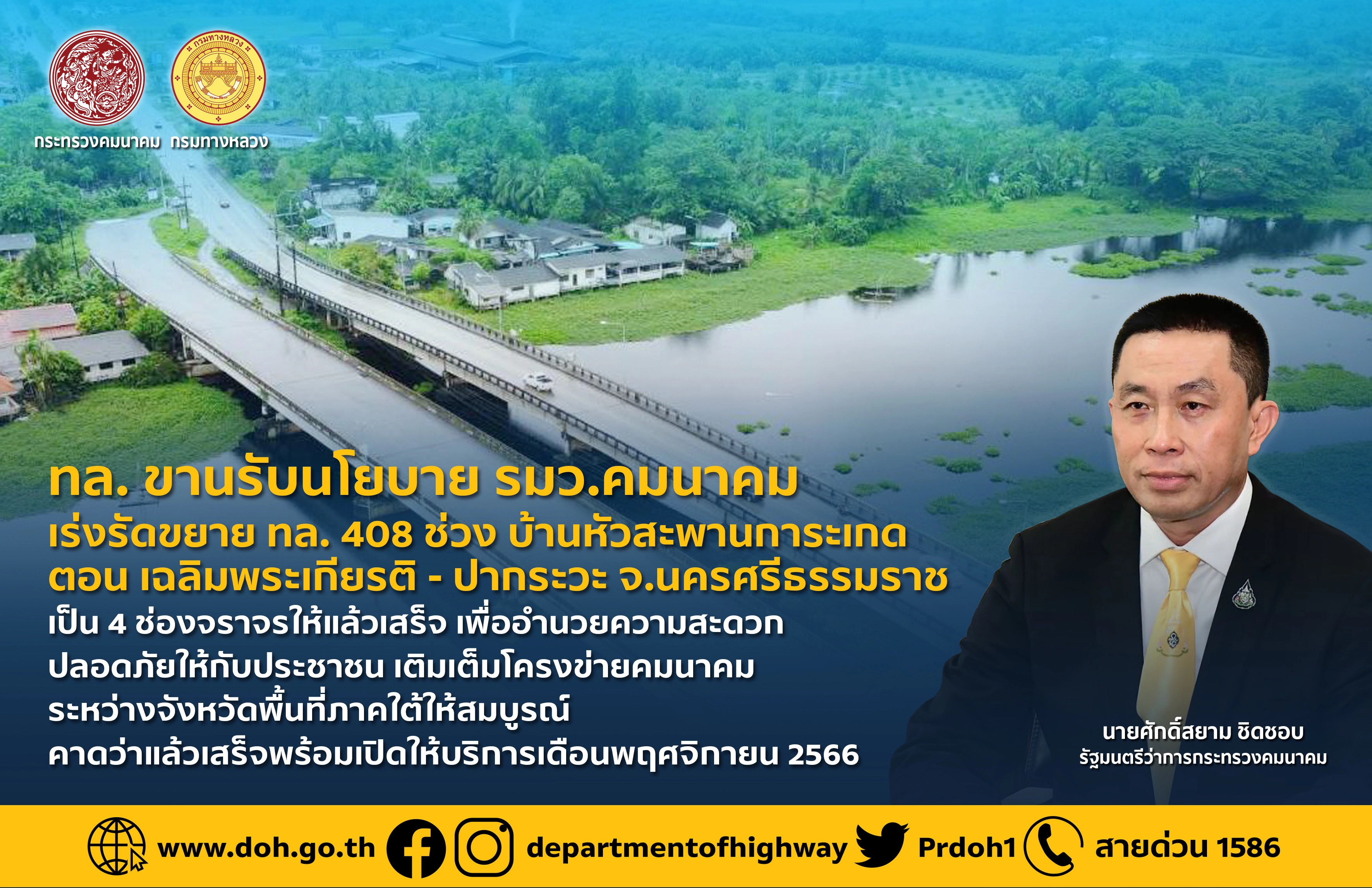 ทล. ขานรับนโยบาย รมว.คมนาคม เร่งรัดขยายทางหลวงหมายเลข 408 ช่วง บ้านหัวสะพานการะเกด ตอน เฉลิมพระเกียรติ - ปากระวะ จ.นครศรีธรรมราช เป็น 4 ช่องจราจรให้แล้วเสร็จ เพื่ออำนวยความสะดวกปลอดภัยให้กับประชาชน เติมเต็มโครงข่ายคมนาคมระหว่างจังหวัดพื้นที่ภาคใต้ให้สมบูรณ์ คาดว่าจะแล้วเสร็จพร้อมเปิดให้บริการเดือนพฤศจิกายน 2566