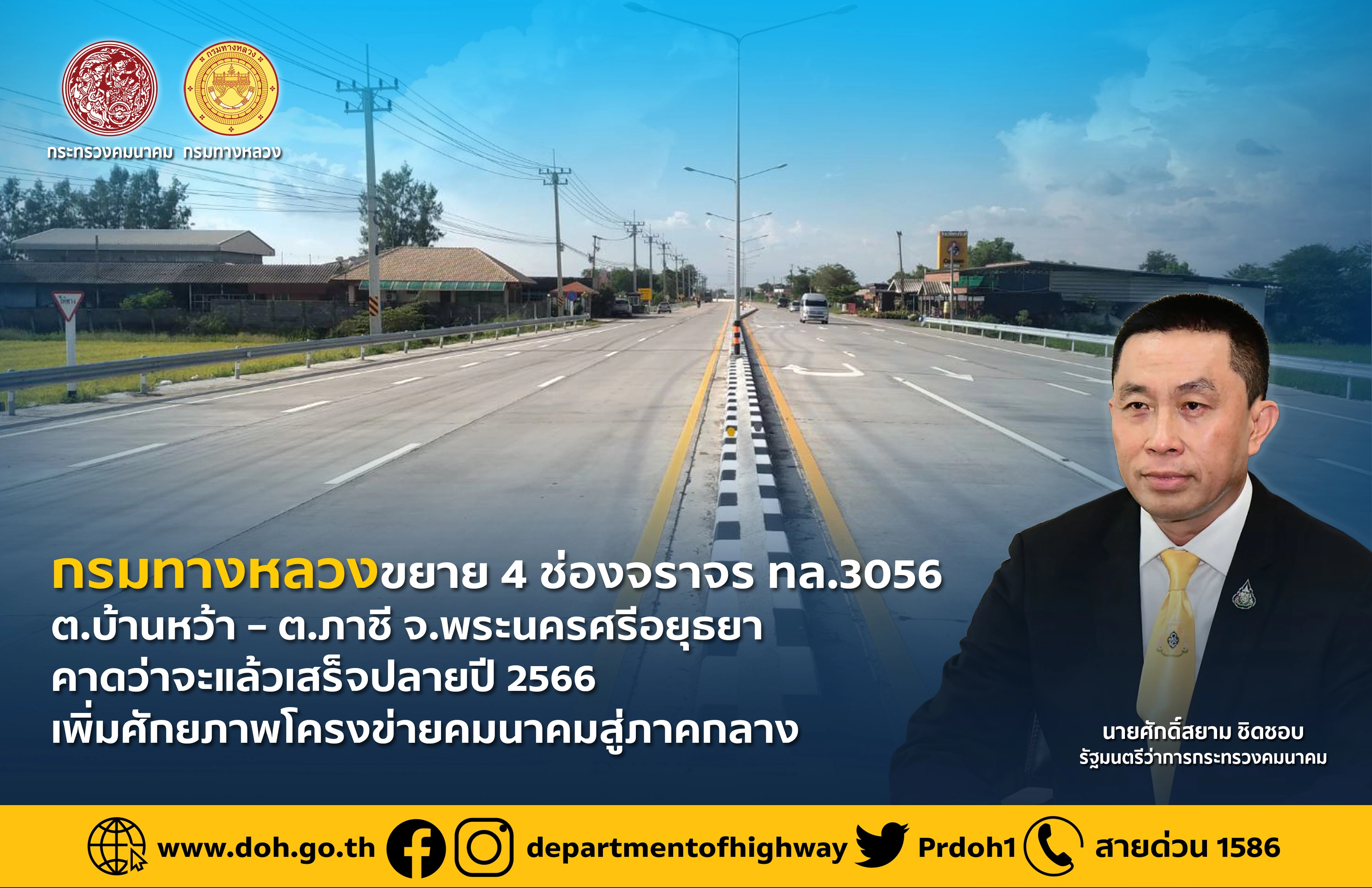 กรมทางหลวงขยาย 4 ช่องจราจร ทล.3056 ต.บ้านหว้า – ต.ภาชี จ.พระนครศรีอยุธยา คาดว่าจะแล้วเสร็จปลายปี 2566 เพิ่มศักยภาพโครงข่ายคมนาคมสู่ภาคกลาง