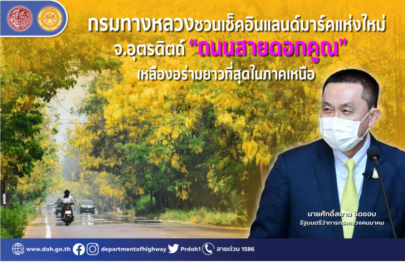 กรมทางหลวง โดย แขวงทางหลวงอุตรดิตถ์ที่ 1 เชิญชวนผู้ใช้ทางชมความสวยงามของถนนสายดอกคูณ จังหวัดอุตรดิตถ์ ที่บานพร้อมกันในช่วงฤดูร้อนของทุกปี เป็นแนวยาวที่สุดในภาคเหนือ ซึ่งจะออกดอกให้ชื่นชมปีละครั้งเท่านั้น พร้อมทั้งดำเนินการเตรียมความพร้อมปรับปรุงทางหลวงให้สวยงาม ตามนโยบาย “คมนาคมสีสัน สร้างสรรค์ประเทศไทย” ของนายศักดิ์สยาม ชิดชอบ รัฐมนตรีว่าการกระทรวงคมนาคม ที่ได้สั่งการให้กรมทางหลวงเตรียมความพร้อมในทุกด้าน โดยเฉพาะเรื่องการอำนวยความสะดวกในการเดินทาง และปรับปรุงทัศนียภาพทางหลวง ให้มีความสวยงาม