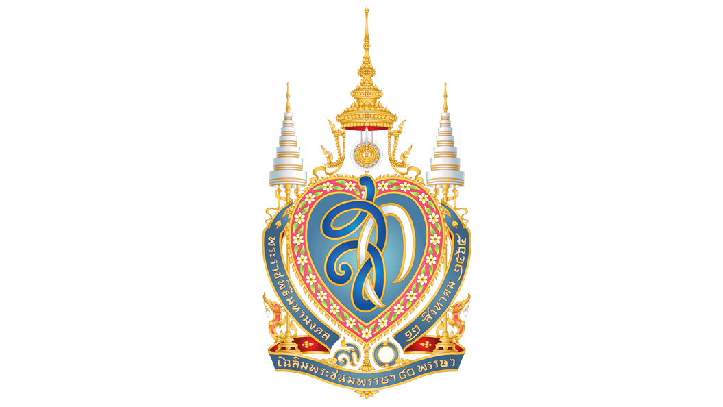 The Royal Emblem depicts, at centre, Her Majesty Queen Sirikit The Queen Mother’s initials: the Thai letters “ส” “ก”; the “ส” letter is in blue, the colour of Her Majesty’s day of birth, and the “ก” letter is in white, the colour of the power and might of Her Majesty’s day of birth. A heart-shaped frame trimmed with braiding of jasmine flowers, lies on a background of pink-signifying the glory of Her Majesty’s day of birth. On top of the Royal Cypher rests the Great Crown which encases the Chakri discus and the Trident, denoting that Her Majesty belongs to the Chakri Dynasty. The Great Crown is at the same time flanked left and right by Seven-Tier Umbrellas of rank. Surrounding the Royal Cypher is the heart-shaped frame, trimmed by jasmine flowers, emblematic of Mother’s Day, braided into a garland, being twined together as one with the hearts of all her subjects, a people united in solidarity and deep respect for Her Majesty, Mother of the Nation; a fount of benevolence nurturing the kingdom and all in the land, giving them support to stave off adversity and earn a living. Swans, on the left and right, each holding an Umbrella, represent Her Majesty’s swan-like beauty and grace. Lines of Thai traceries signify Her Majesty’s many accomplishments in the arts and culture underlying the creation of Her Majesty’s Supplementary Occupations Foundation and her gracious promotion of Thai national identity both within the country and beyond, making it well-known and in vogue. The number 90 in Thai numerals, placed under a heart-shaped garland signifies the auspicious number of the 90th birthday anniversary of Her Majesty The Queen Mother. Beneath the crest lies a blue silk ribbon on which are inscribed the words “Celebrations on the Auspicious Occasion of Her Majesty The Queen Mother’s 90th Birthday Anniversary 12th August 2022”