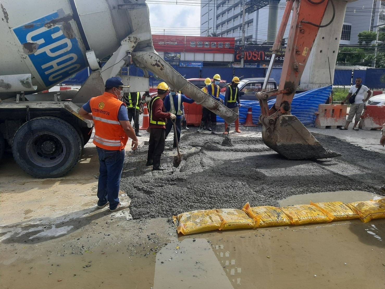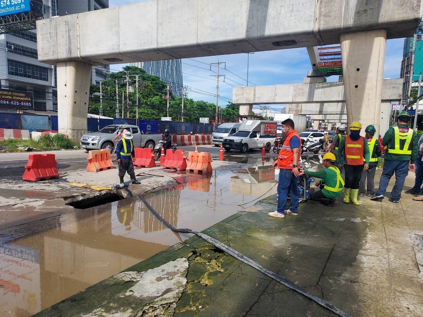 2. ดำเนินการแก้ไขเพื่อคืนพื้นผิวจราจรให้สามารถเปิดการสัญจรชั่วคราวโดยการรื้อสกัดผิวถนนที่ทรุดตัว หาโพรงที่มีการรั่วซึมและนำทรายหยาบลง พร้อมเทคอนกรีต high strength fast setting แล้วปูแผ่นเหล็กทับชั่วคราว ซึ่งคาดว่าจะแล้วเสร็จและเปิดการจราจรตามปกติได้ในเวลาประมาณ 18.30 น. ของวันนี้ (11 กันยายน 2565) เพื่ออำนวยความสะดวกในการเดินทางให้กับประชาชน
