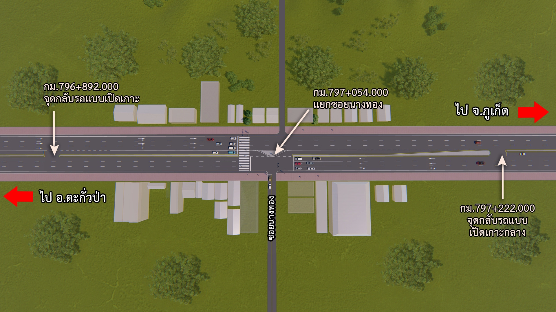 1. รูปแบบจุดกลับรถระดับพื้นราบจำนวน 2 แห่งคือ กม. 796+892 และ กม. 797+222 เป็นจุดกลับรถแบบเปิดเกาะกลางบริเวณด้านหัวและด้านท้ายแยกซอยนางทอง และ กม. 801+870 จุดกลับรถแบบเปิดเกาะบริเวณบ้านเขาหลักเพื่อรองรับรถที่จะเลี้ยวรถเข้าซอยเขาหลัก