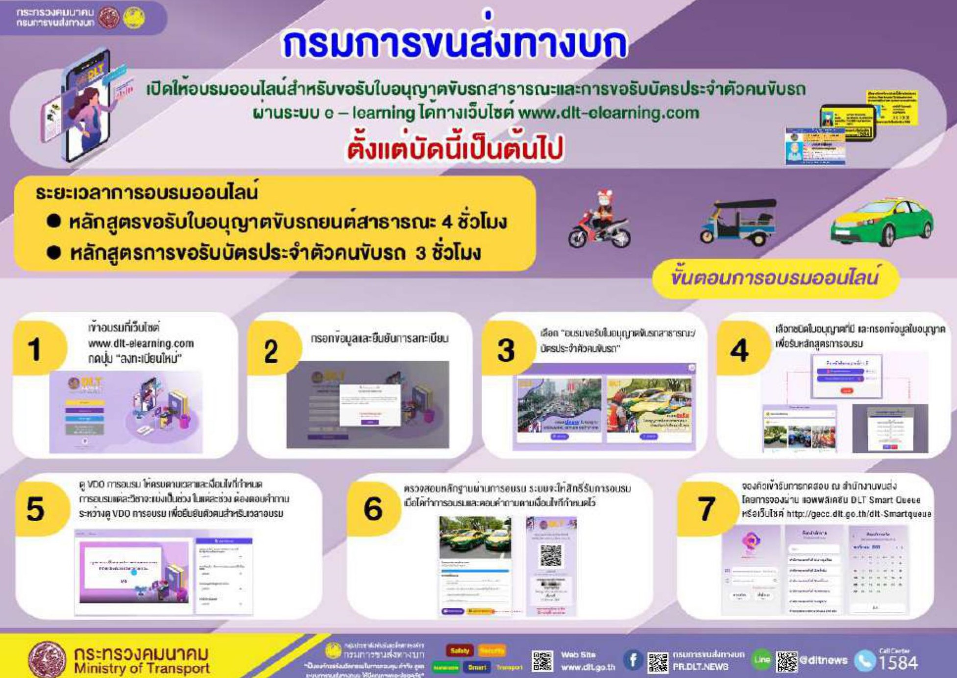 5. กรมการขนส่งทางบกเปิดให้อบรมออนไลน์สำหรับขอรับใบอนุญาตขับรถสาธารณะ และขอรับบัตรประจำตัวคนขับรถ ผ่านระบบ e-learning ตั้งแต่บัดนี้เป็นต้นไป
