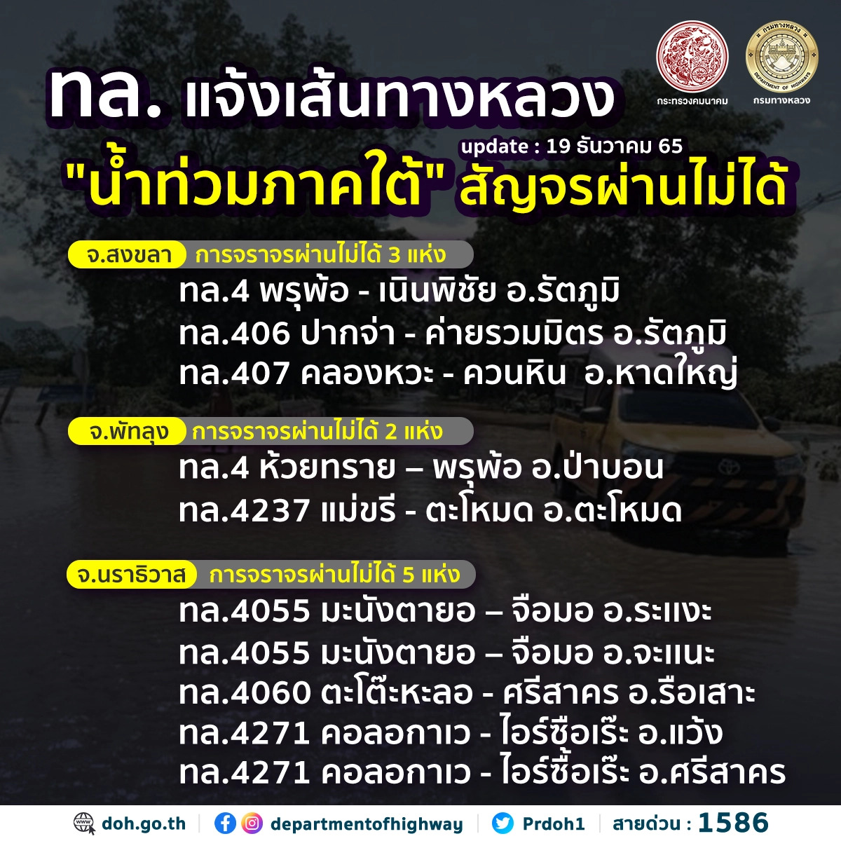 พร้อมกันนี้กรมทางหลวง ได้ทำการสรุปสถานการณ์อุทกภัยและดินสไลด์บนทางหลวง โดย สถานการณ์ประจำวันที่ 19 ธันวาคม 2565 เวลา 15.00 น. พบทางหลวงถูกน้ำท่วม/ดินสไลด์ ในพื้นที่ ภาคใต้ จำนวน 5 จังหวัด 21 สายทาง 31 แห่ง ที่การจราจรผ่านไม่ได้ 10 แห่ง ดังนี้