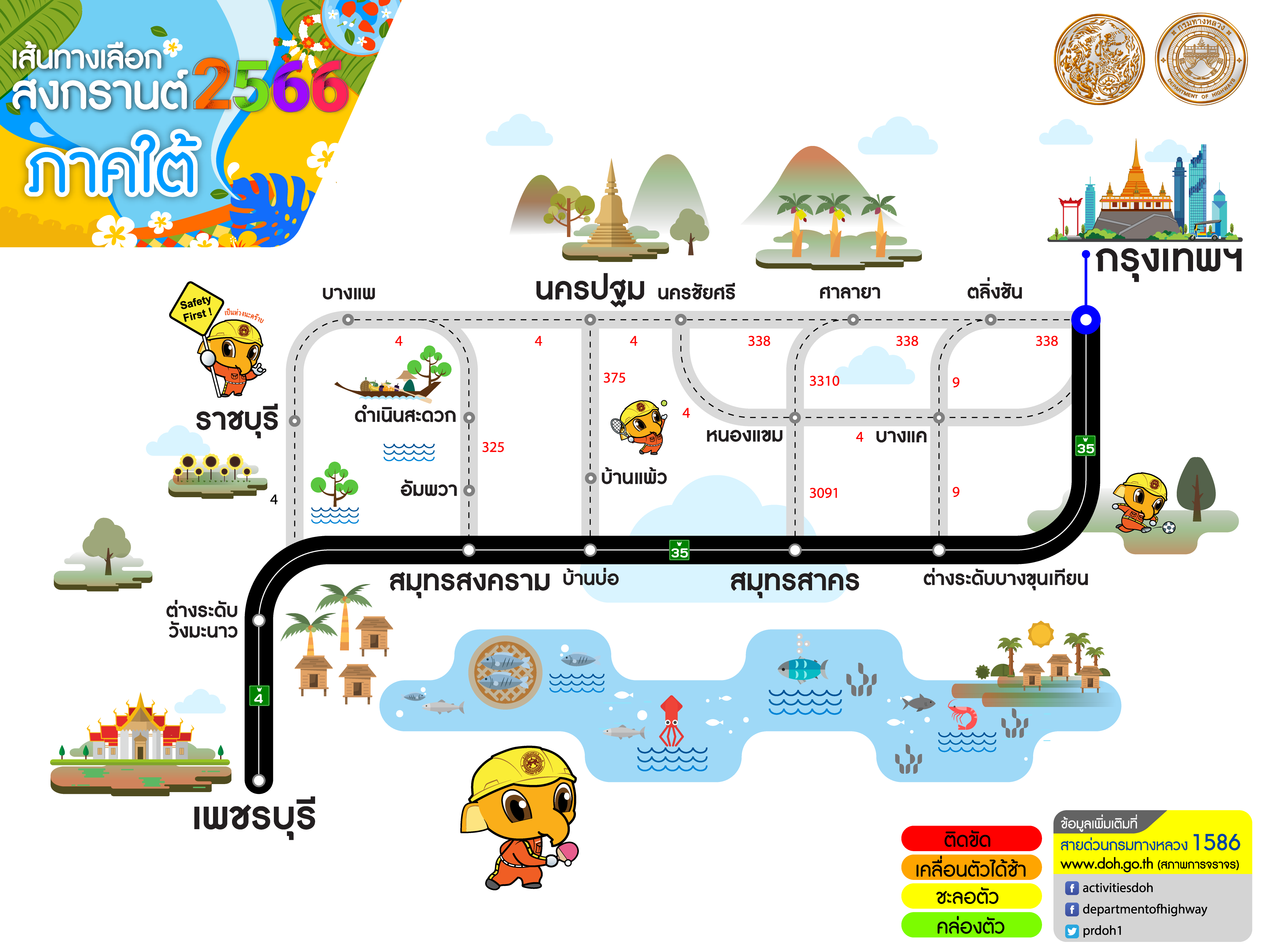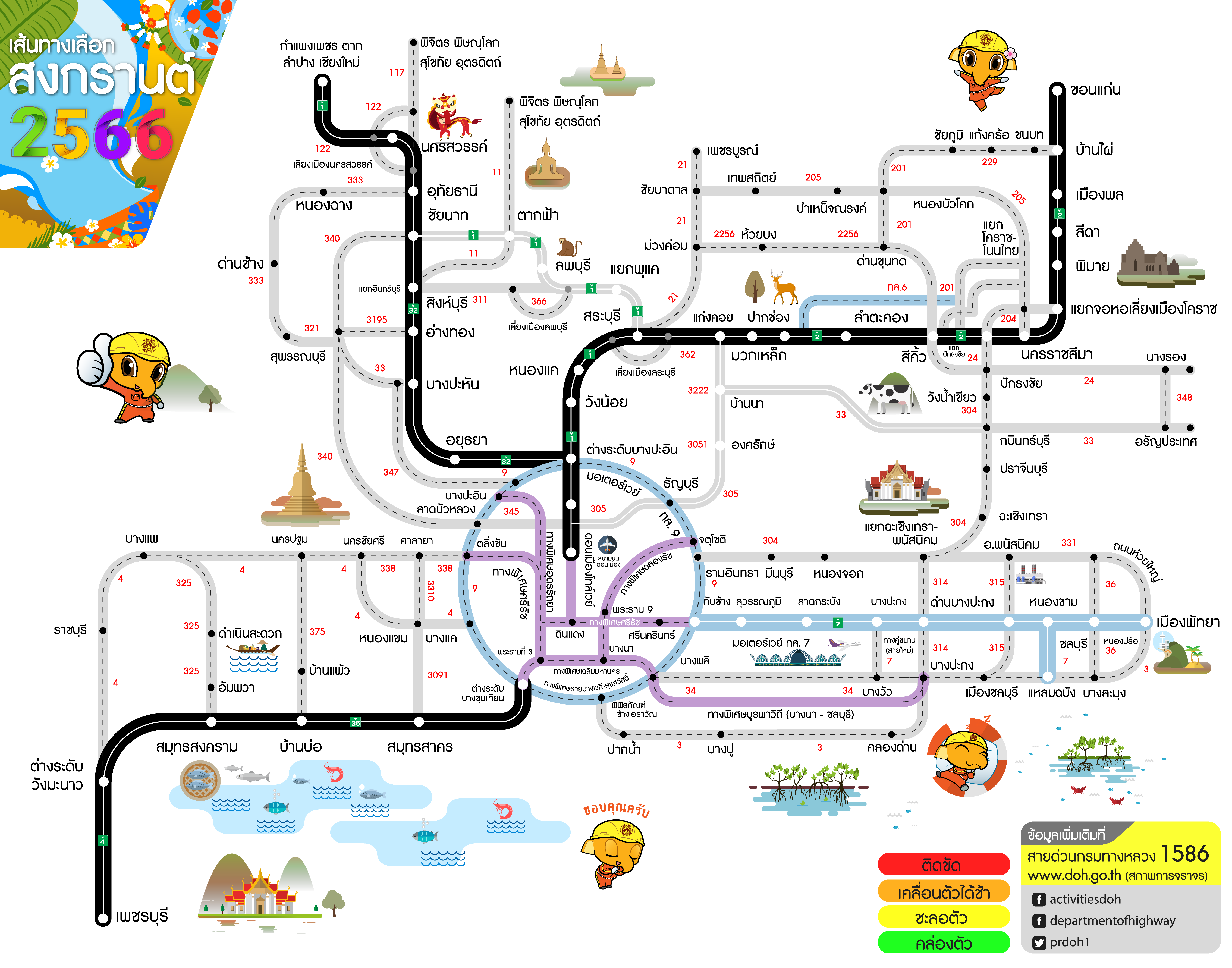 กรมทางหลวงแนะนำเส้นทางเลือกจากกรุงเทพฯ สู่ภูมิภาคต่าง ๆ ช่วงเทศกาลสงกรานต์ 2566 เพื่อให้ผู้ใช้เส้นทางได้รับความสะดวก รวดเร็วในการเดินทาง สอบถามโทร 1586 ฟรีทุกเครือข่ายตลอด 24 ชั่วโมง