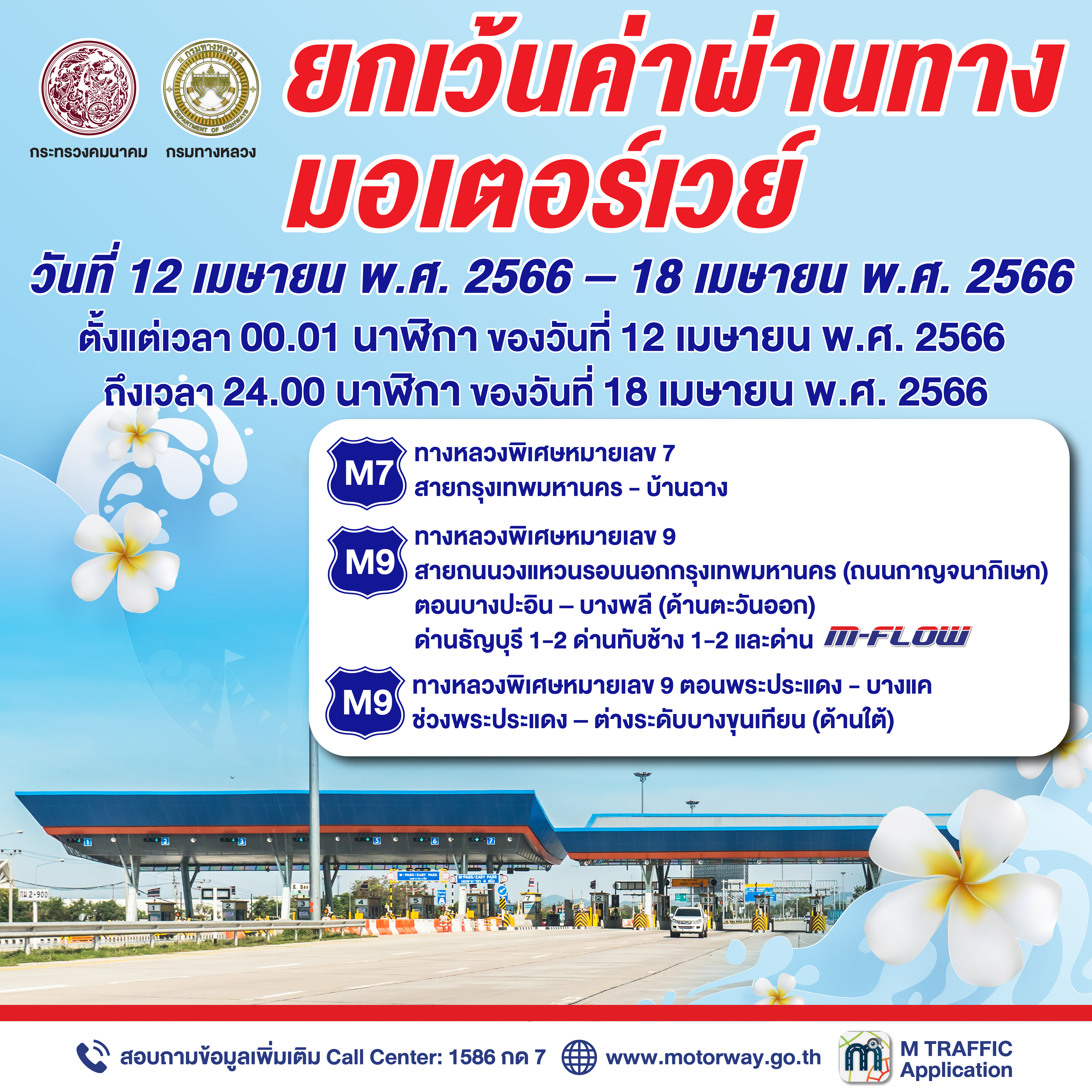 ครม. ไฟเขียว ยกเว้นค่าผ่านทางมอเตอร์เวย์สาย 7 และ 9 ช่วงสงกรานต์ฟรี 7 วัน ตั้งแต่วันที่ 12 - 18 เม.ย. 66 เพื่อลดภาระค่าใช้จ่ายและอำนวยความสะดวกให้ประชาชน