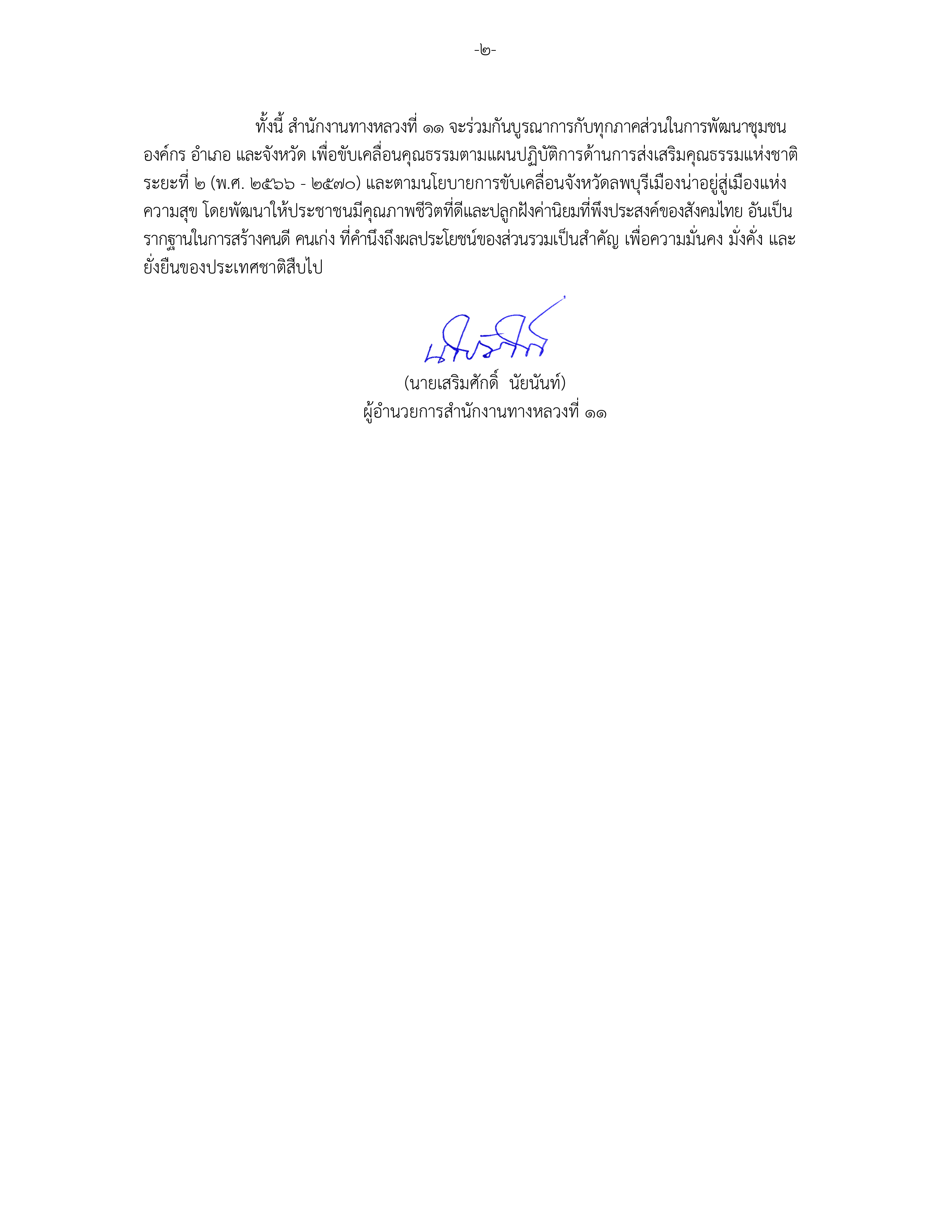 ทั้งนี้ สำนักงานทางหลวงที่ 11 จะร่วมกันบูรณาการกับทุกภาคส่วนในการพัฒนาชุมชน องค์กร อำเภอ และจังหวัด เพื่อขับเคลื่อนคุณธรรมตามแผนปฏิบัติการด้านการส่งเสริมคุณธรรมแห่งชาติ ระยะที่ 2 (พ.ศ. 2566 - 2570) และตามนโยบายการขับเคลื่อนจังหวัดลพบุรีเมืองน่าอยู่สู่เมืองแห่งความสุข โดยพัฒนาให้ประชาชนมีคุณภาพชีวิตที่ดีและปลูกฝังค่านิยมที่พึงประสงค์ของสังคมไทย อันเป็นรากฐานในการสร้างคนดี คนเก่ง ที่คำนึงถึงผลประโยชน์ของส่วนรวมเป็นสำคัญ เพื่อความมั่นคง มั่งคั่ง และยั่งยืนของประเทศชาติสืบไป