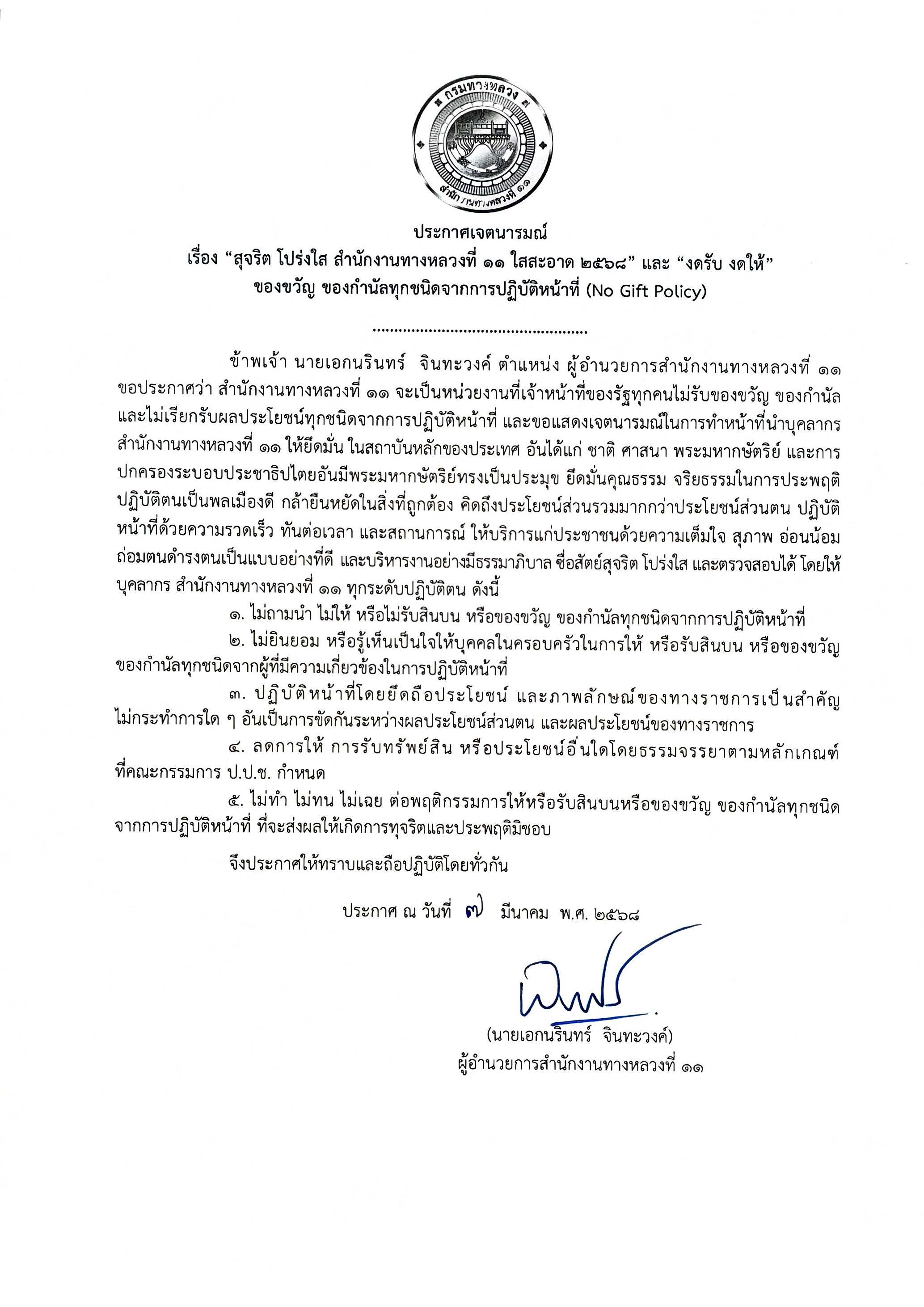 ประกาศเจตนารมณ์ "สุจริต โปร่งใส สำนักงานทางหลวงที่ 11 ใสสะอาด 2568" และ "งดรับ งดให้"ของขวัญ ของกำนัลทุกชนิดจากการปฏิบัติหน้าที่ (No Gift Policy)