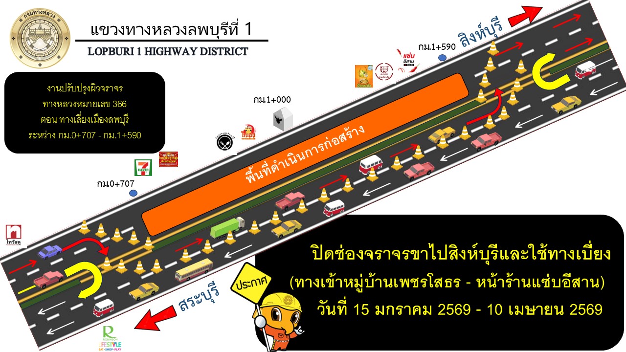 แขวงทางหลวงลพบุรีที่ 1 ขอประชาสัมพันธ์ การปิดช่องจราจรและใช้ทางเบี่ยง งานปรับปรุงผิวจราจรทางหลวงหมายเลข 366 ตอนทางเลี่ยงเมืองลพบุรี