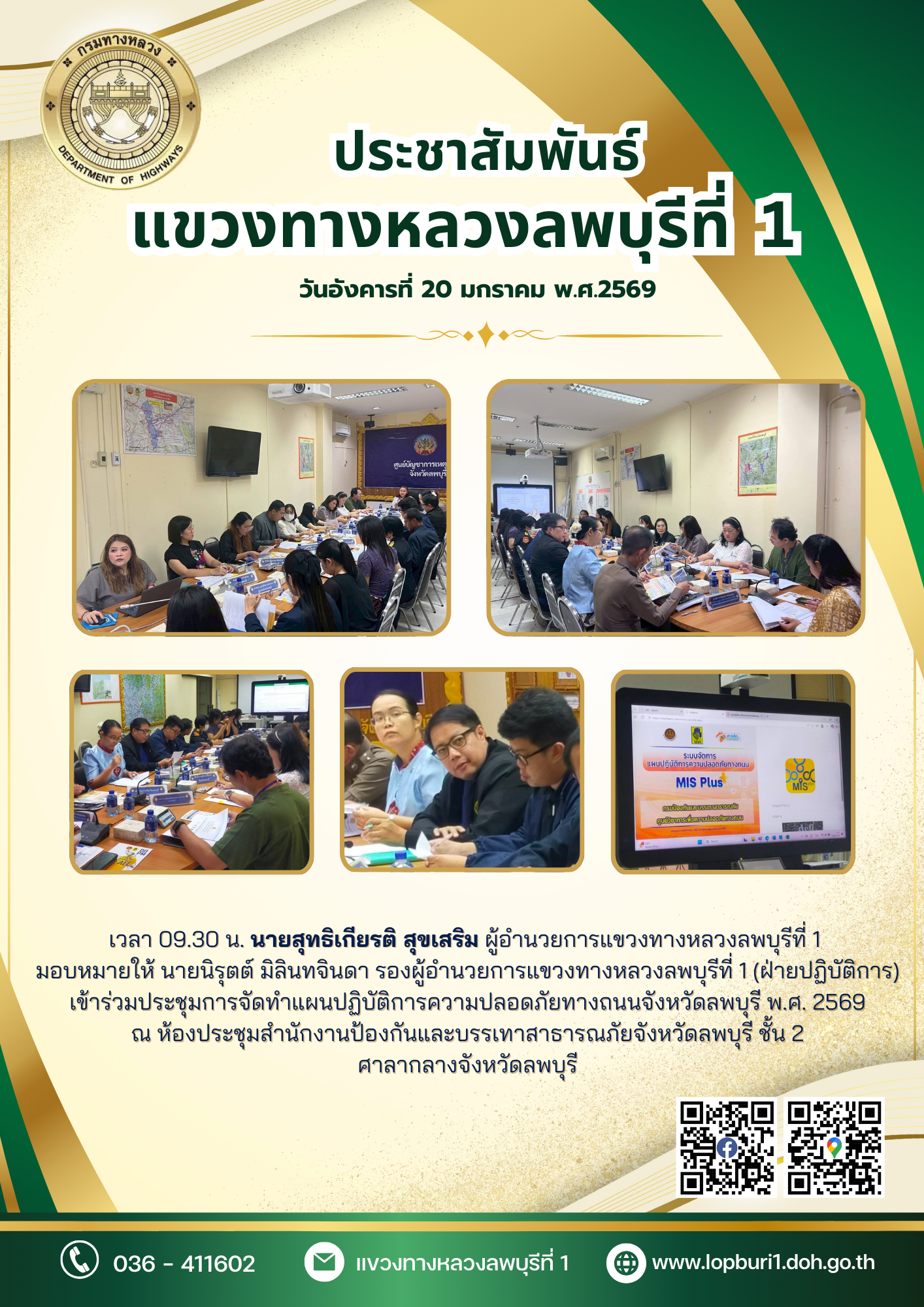 นายสุทธิเกียรติ สุขเสริม ผู้อำนวยการแขวงทางหลวงลพบุรีที่ 1 มอบหมายให้ นายนิรุตต์ มิลินทจินดา รองผู้อำนวยการแขวงทางหลวงลพบุรีที่ 1 (ฝ่ายปฏิบัติการ) เข้าร่วมประชุมการจัดทำแผนปฏิบัติการความปลอดภัยทางถนนจังหวัดลพบุรี พ.ศ. 2569
