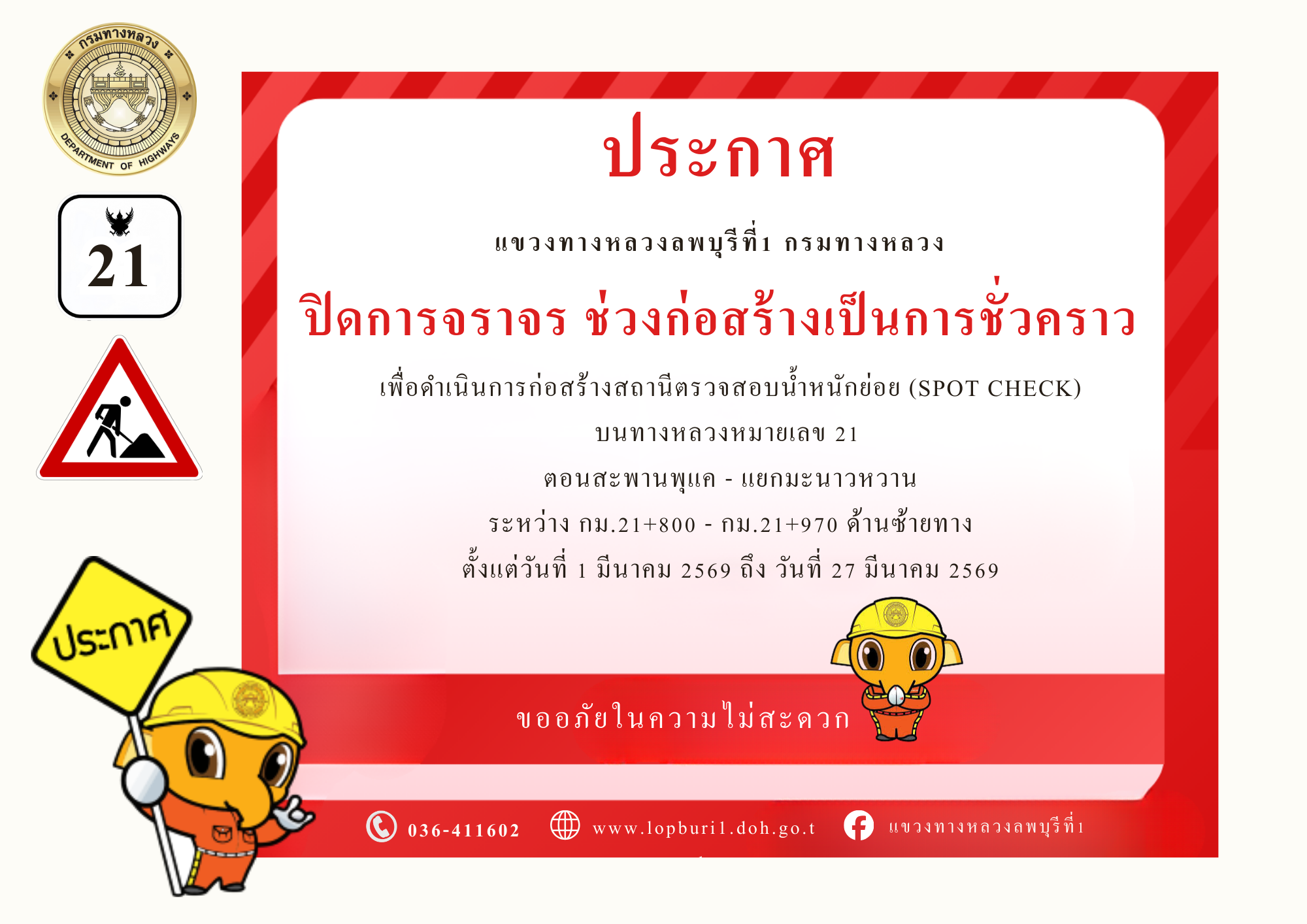แขวงทางหลวงลพบุรีที่ 1 ขอประชาสัมพันธ์ ปิดการจราจร ช่วงก่อสร้างเป็นการชั่วคราว เพื่อดำเนินการก่อสร้างสถานีตรวจสอบน้ำหนักย่อย (SPOT CHECK) ทางหลวงหมายเลข 21 ตอนสะพานพุแค - แยกมะนาวหวาน ระหว่าง กม.21+800 - กม.21+970 ด้านซ้ายทาง ตั้งแต่วันที่ 1 มีนาคม - วันที่ 27 มีนาคม 2569 ตลอด 24 ชั่วโมง ขออภัยในความไม่สะดวก