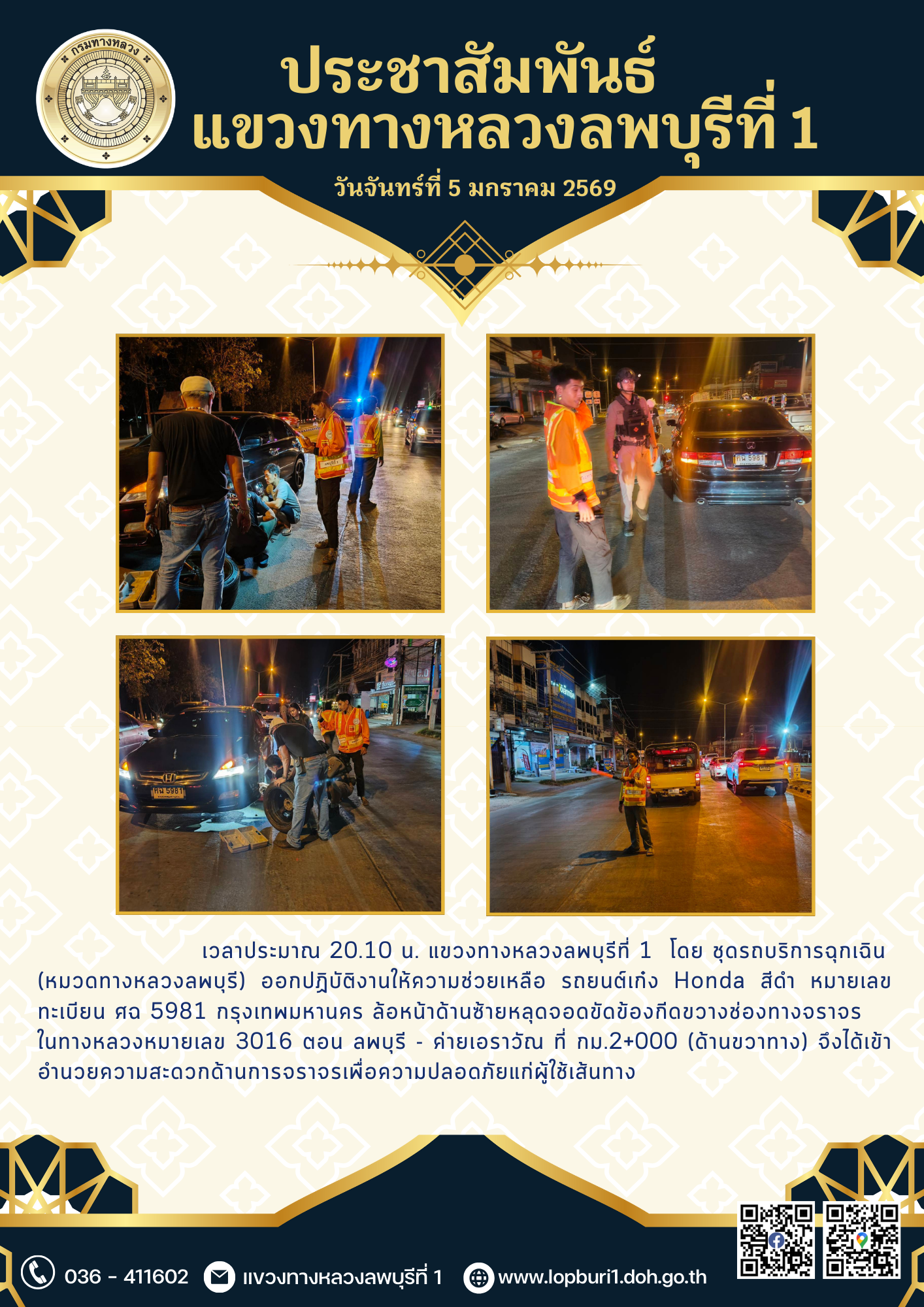แขวงทางหลวงลพบุรีที่ 1 โดย ชุดรถบริการฉุกเฉิน (หมวดทางหลวงลพบุรี) ให้ความช่วยเหลือประชาชน ที่มาสอบถามเส้นทาง โดย นำไปส่งจุดหมายที่ต้องการ