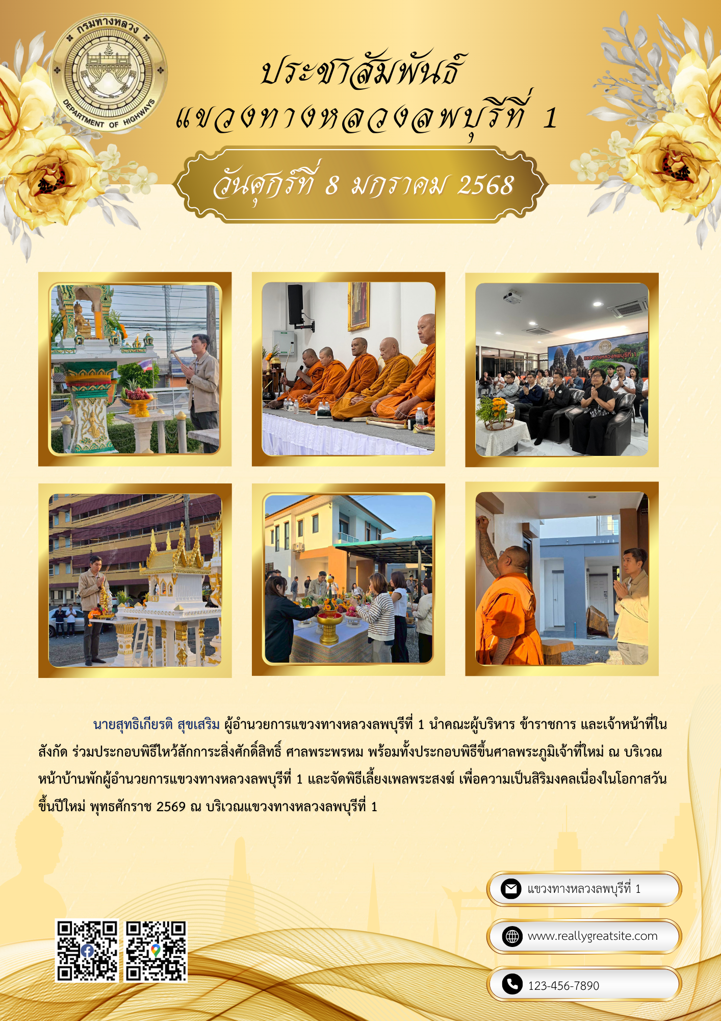 นายสุทธิเกียรติ สุขเสริม ผู้อำนวยการแขวงทางหลวงลพบุรีที่ 1 นำคณะผู้บริหาร ข้าราชการ และเจ้าหน้าที่ในสังกัด ร่วมประกอบพิธีไหว้สักการะสิ่งศักดิ์สิทธิ์ ศาลพระพรม พร้อมทั้งประกอบพิธีขึ้นศาลพระภูมิเจ้าที่ใหม่