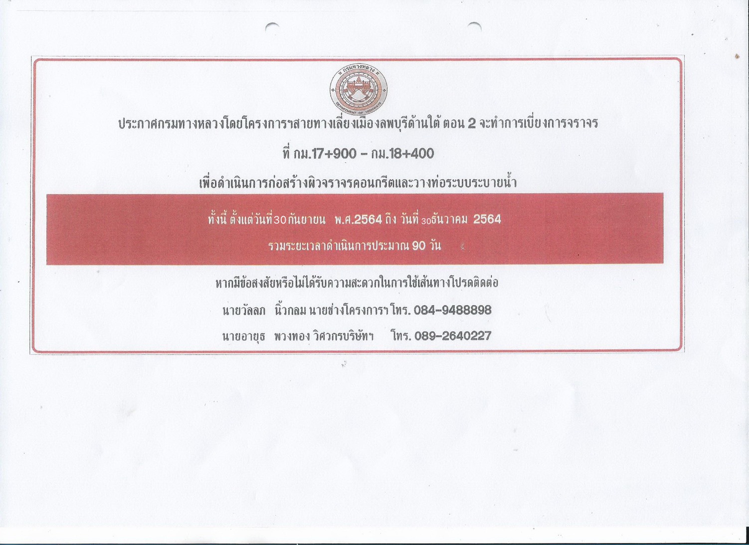 โดยจะทำการเบี่ยงจราจรระหว่างก่อสร้างในการสัญจรผ่านพื้นที่ก่อสร้างเพื่อความสะดวกต่อผู้ใช้เส้นทาง โปรดวางแผนการใช้เส้นทางและหลีกเลี่ยงเส้นทางดังกล่าว ขออภัยในความไม่สะดวก