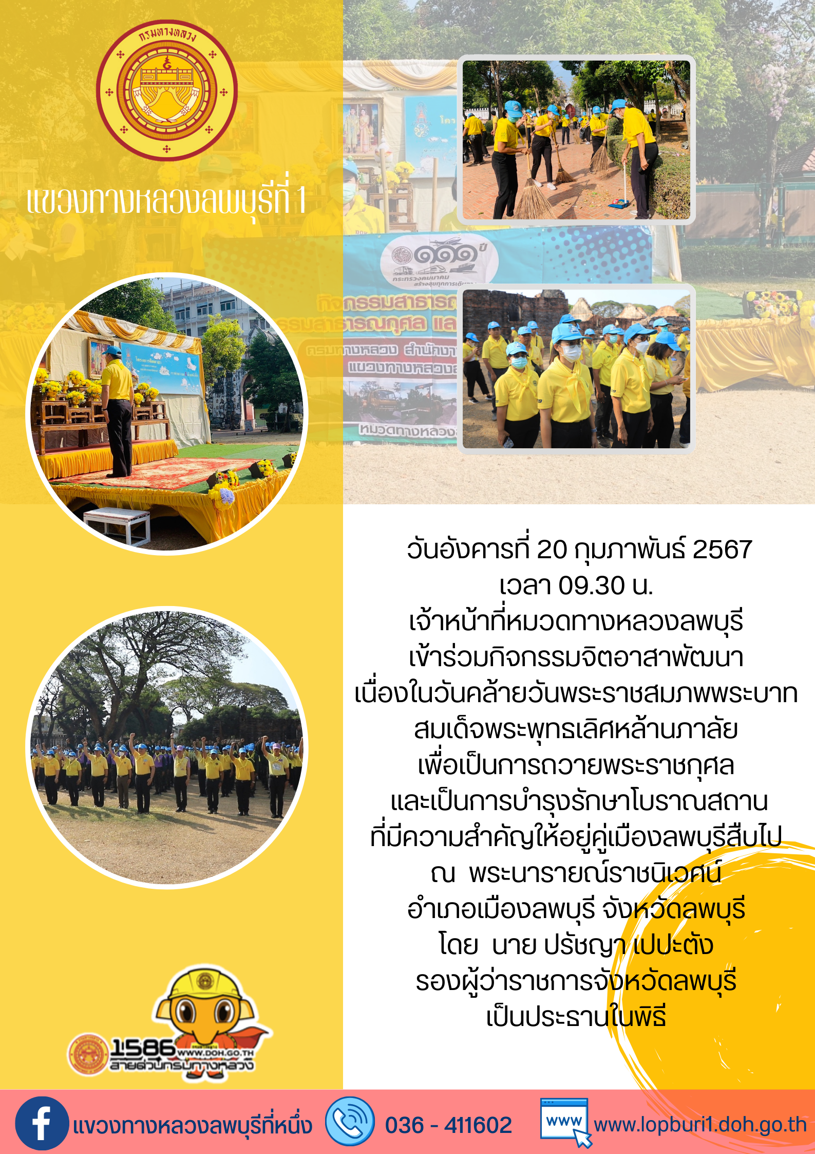 เจ้าหน้าที่หมวดทางหลวงลพบุรี เข้าร่วมกิจกรรมจิตอาสาพัฒนา เนื่องในวันคล้ายวันพระราชสมภพพระบาทสมเด็จพระพุทธเลิศหล้านภาลัย เพื่อเป็นการถวายพระราชกุศล และเป็นการบำรุงรักษาโบราณสถาน ที่มีความสำคัญให้อยู่คู่เมืองลพบุรีสืบไป ณ พระนารายณ์ราขนิเวศน์ อำเภอเมืองลพบุรี จังหวัดลพบุรี โดยมี นายปรัชญา เปปะตัง รองผู้ว่าราชการจังหวัดลพบุรีเป็นประธานในพิธี