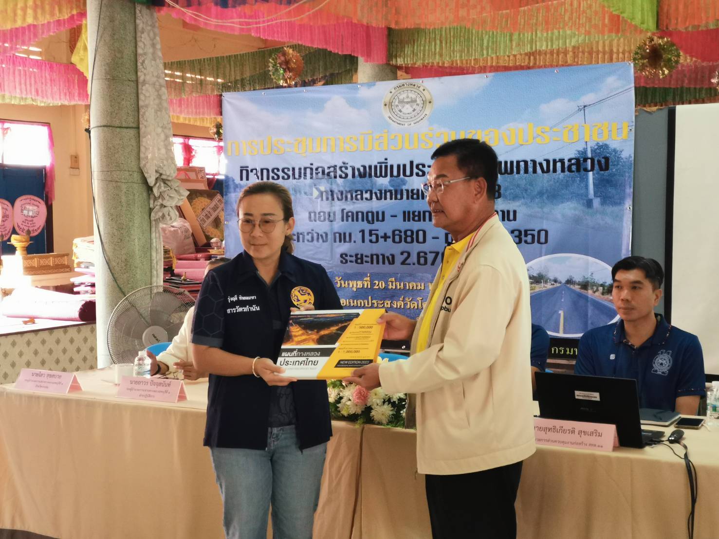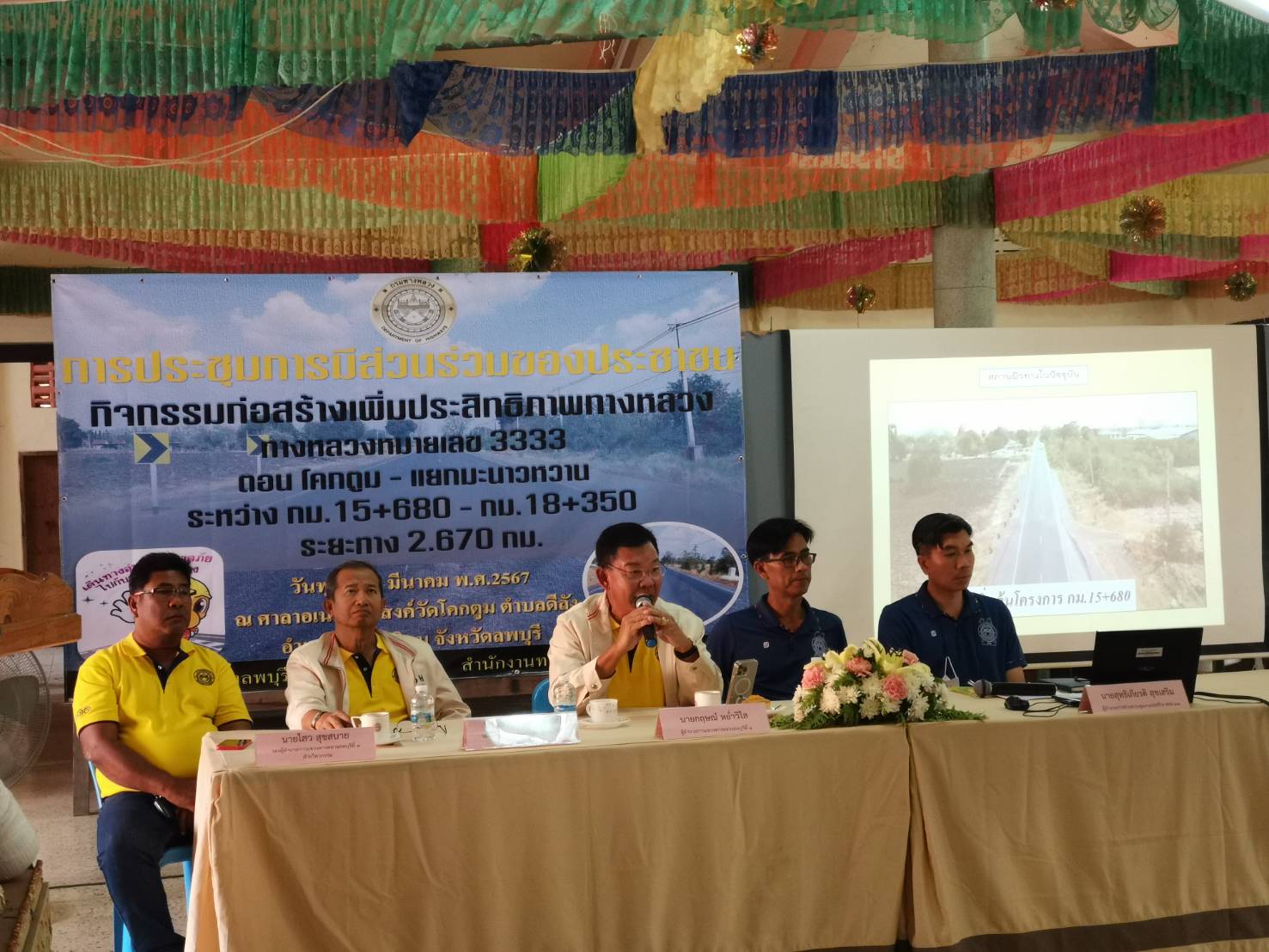 นายกฤษณ์ หย่ำวิไล ผู้อำนวยการแขวงทางหลวงลพบุรีที่ 1 พร้อมด้วยเจ้าหน้าที่แขวงทางหลวงลพบุรีที่ 1 จัดการประชุมรับฟังการบรรยายพร้อมแสดงความคิดเห็น และร่วมแลกเปลี่ยนข้อมูล โครงการก่อสร้างเพิ่มประสิทธิภาพทางหลวง ทางหลวงหมายเลข 3333 ตอน โคกตูม - แยกมะนาวหวาน ระหว่าง กม.15+680 – กม.18+350 โดยมีนายสุทธิเกียรติ สุขเสริม ผู้อำนวยการส่วนควบคุมงานก่อสร้าง สำนักงานทางหลวงที่ 11 และนายสามารถ ลัดดาแย้ม นายช่างสำรวจอาวุโส สำนักงานทางหลวงที่ 11 เป็นวิทยากรให้คำแนะนำแก่ตัวแทนหน่วยงานราชการที่เกี่ยวข้อง และประชาชนที่อาศัยอยู่ในบริเวณสองข้างทาง ณ ศาลาอเนกประสงค์วัดโคกตูม ตำบลดีลัง อำเภอพัฒนานิคม จังหวัดลพบุรี