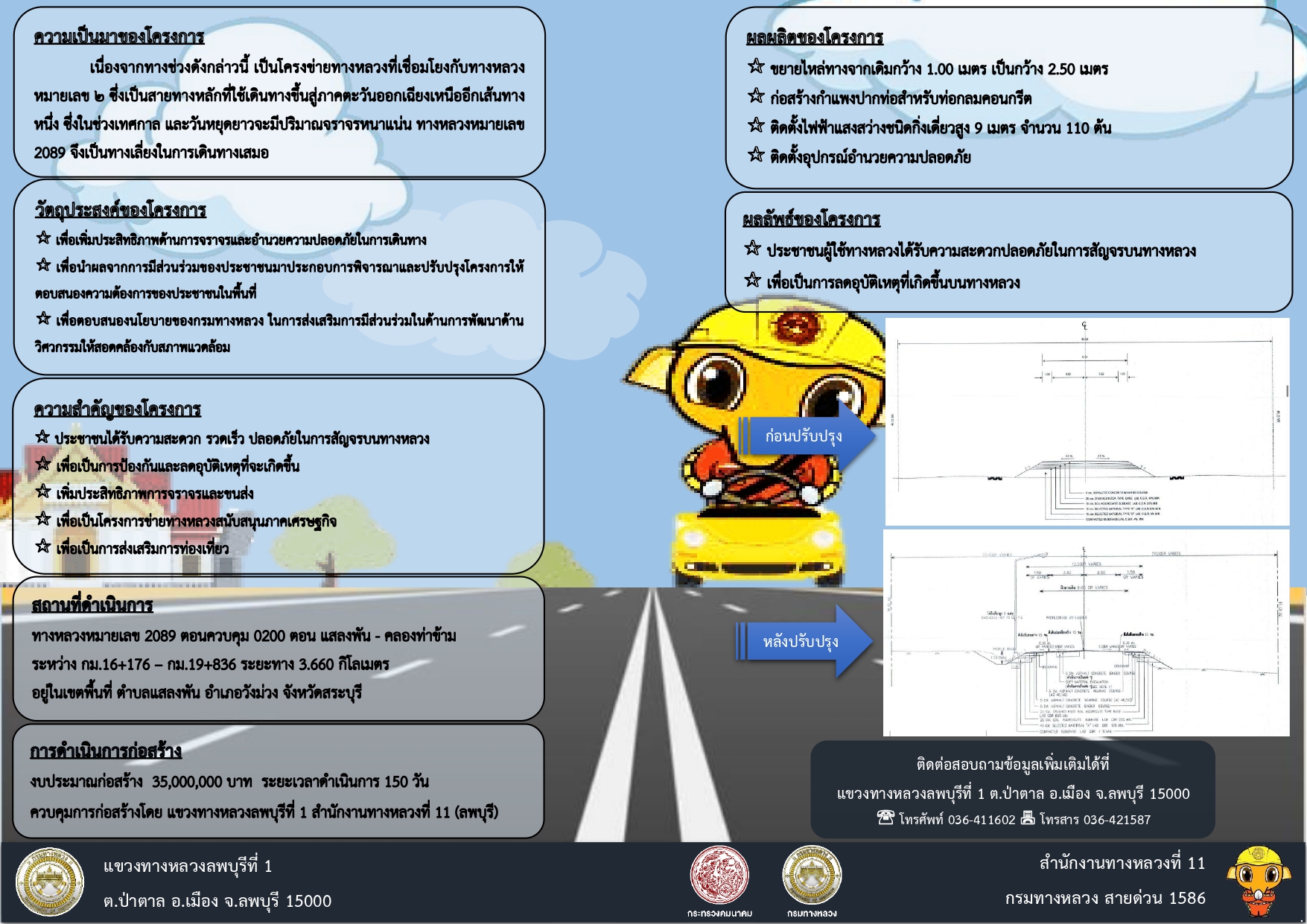 ด้วยแขวงทางหลวงลพบุรีที่ 1 กรมทางหลวง ได้รับจัดสรรงบประมาณปี 2567 โครงการก่อสร้างโครงข่ายทางหลวงแผ่นดินกิจกรรมก่อสร้างทางหลวงพัฒนาพื้นที่ระดับภาค ทางหลวงหมายเลข 2089 ตอน ตอน แสลงพัน – คลองท่าข้าม ระหว่าง กม.16+176 – กม.19+836