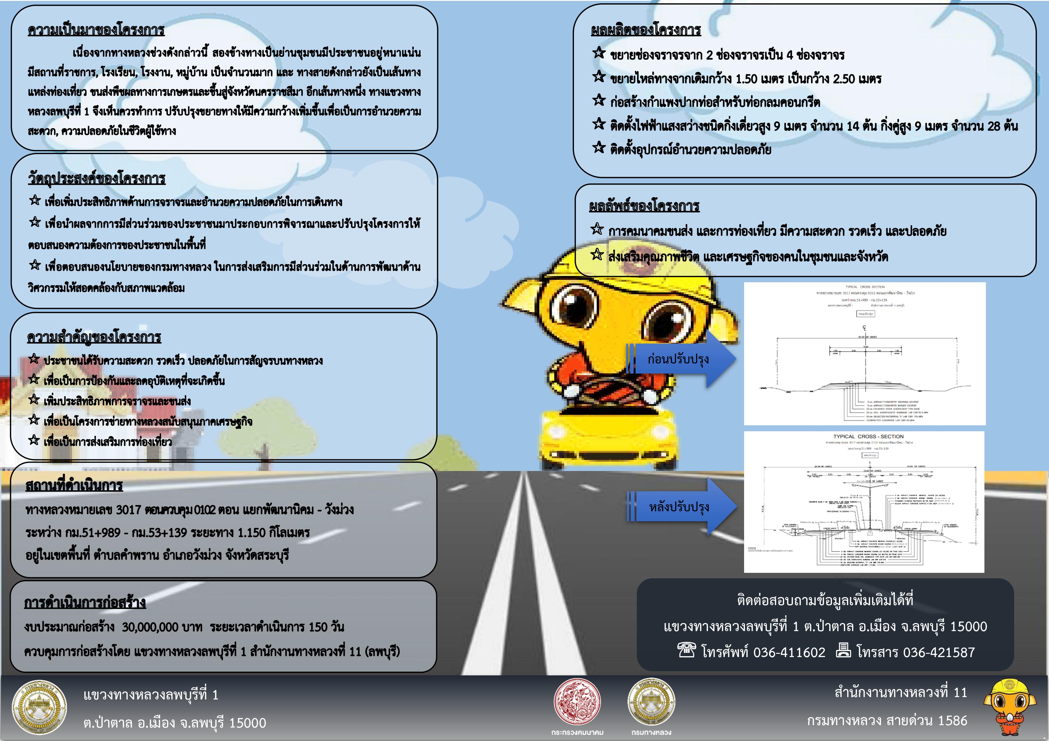 ด้วยแขวงทางหลวงลพบุรีที่ 1 กรมทางหลวง ได้รับจัดสรรงบประมาณปี 2568 โครงการก่อสร้างโครงข่ายทางหลวงแผ่นดิน กิจกรรมก่อสร้างทางหลวงพัฒนาพื้นที่ระดับภาค งานก่อสร้างเพิ่มมาตรฐานทางหลวงระดับภาค ทางหลวงหมายเลข 3017 ตอน แยกพัฒนานิคม - วังม่วง ระหว่าง กม.51+989 - กม.53+139 ปริมาณงาน 1 แห่ง โดยจะทำการขยายช่องจราจรจาก 2 ช่องจราจร เป็น 4 ช่องจราจรพร้อมขยายไหล่ทาง พร้อมติดตั้งไฟฟ้าแสงสว่าง/อุปกรณ์อำนวยความปลอดภัย เพื่อเพิ่มประสิทธิภาพในการรองรับประมาณจราจรที่เพิ่มมากขึ้น และเพื่ออำนวยความสะดวกปลอดภัยแก่ผู้ใช้ทางหลวงเพื่อให้ประชาชนในพื้นที่ และประชาชนทั่วไปผู้ใช้ทางหลวงได้รับทราบข้อมูลข่าวสาร รายละเอียดวัตถุประสงค์ และรูปแบบการก่อสร้างรวมถึงขั้นตอนการดำเนินงาน และเปิดโอกาสให้ทุกภาคส่วนที่เกี่ยวข้องได้เข้ามามีส่วนร่วมในการแลกเปลี่ยนข้อมูลข่าวสารที่เป็นประโยชน์ นำไปเป็นแนวทางพิจารณาประกอบการดำเนินงานในโครงการก่อสร้างให้เกิดความเหมาะสม และสอดคล้องกับความต้องการของพื้นที่จึงได้จัดให้มีการประชุมขึ้นในครั้งนี้