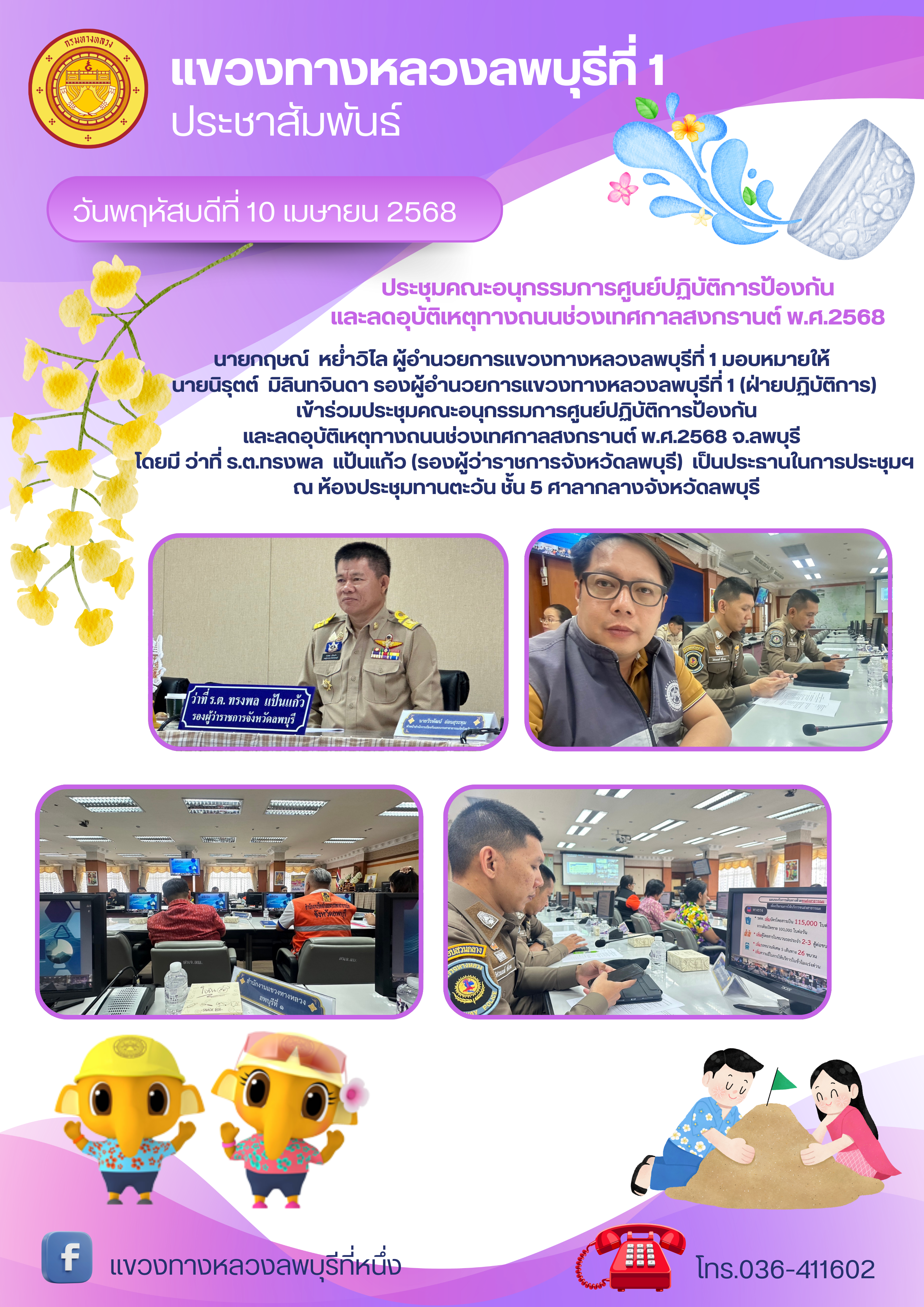 วันพฤหัสบดีที่ 10 เมษายน 2568 เวลา 10:00 น. นายกฤษณ์ หย่ำวิไล ผู้อำนวยการแขวงทางหลวงลพบุรีที่ 1 มอบหมายให้ นายนิรุตต์ มิลินทจินดา รองผู้อำนวยการแขวงทางหลวงลพบุรีที่ 1 (ฝ่ายปฏิบัติการ) เข้าร่วมประชุมคณะอนุกรรมการศูนย์ปฏิบัติการป้องกัน และลดอุบัติเหตุทางถนนช่วงเทศกาลสงกรานต์ พ.ศ.2568 จ.ลพบุรี โดยมี ว่าที่ ร.ต.ทรงพล แป้นแก้ว (รองผู้ว่าราชการจังหวัดลพบุรี) เป็นประธานในการประชุมฯ ณ ห้องประชุมทานตะวัน ชั้น 5 ศาลากลางจังหวัดลพบุรี
