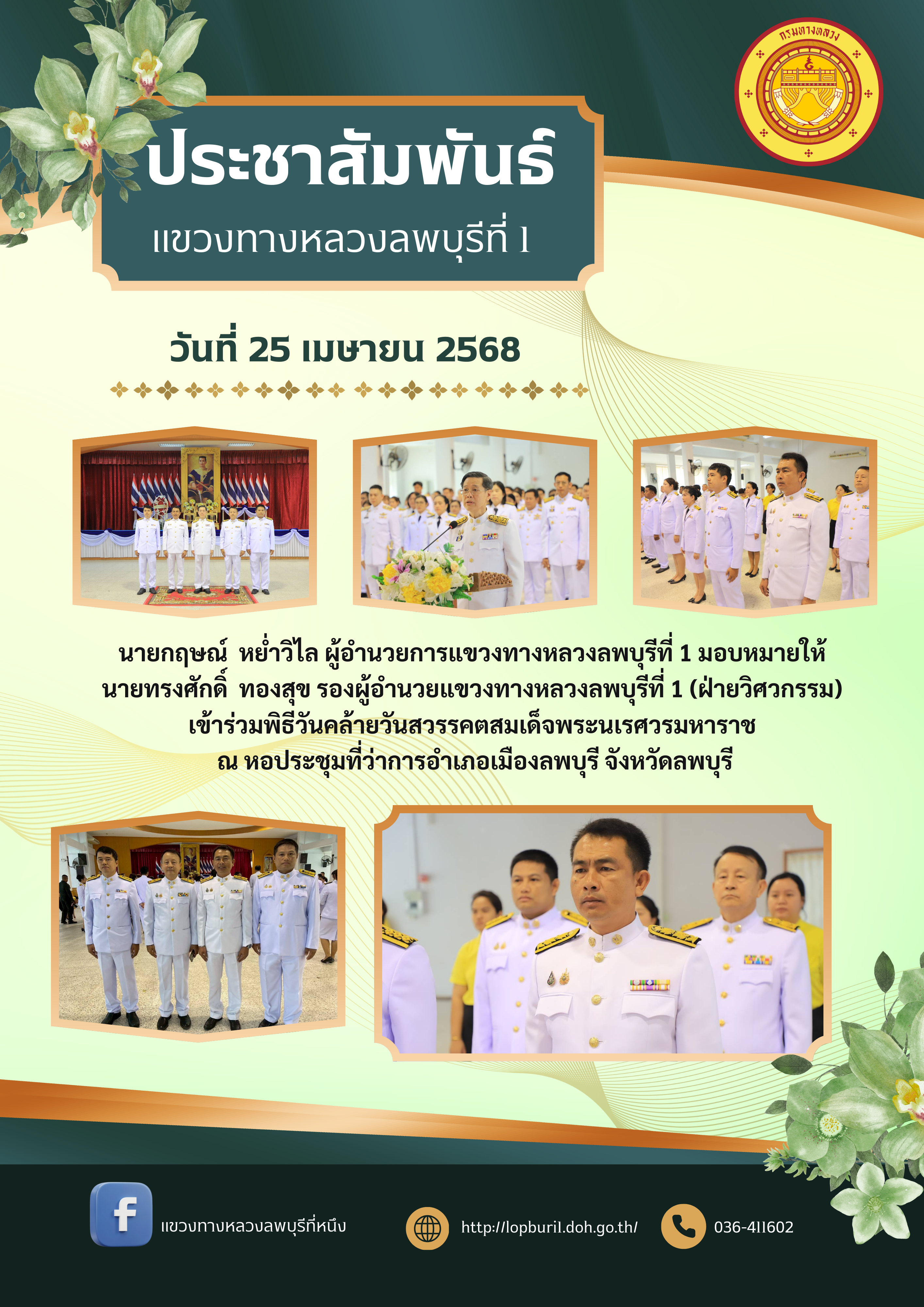 นายกฤษณ์ หย่ำวิไล ผู้อำนวยการแขวงทางหลวงลพบุรีที่ 1 มอบหมายให้ นายทรงศักดิ์ ทองสุข รองผู้อำนวยแขวงทางหลวงลพบุรีที่ 1 (ฝ่ายวิศวกรรม) เข้าร่วมพิธีวันคล้ายวันสวรรคตสมเด็จพระนเรศวรมหาราช ณ หอประชุมที่ว่าการอำเภอเมืองลพบุรี จังหวัดลพบุรี