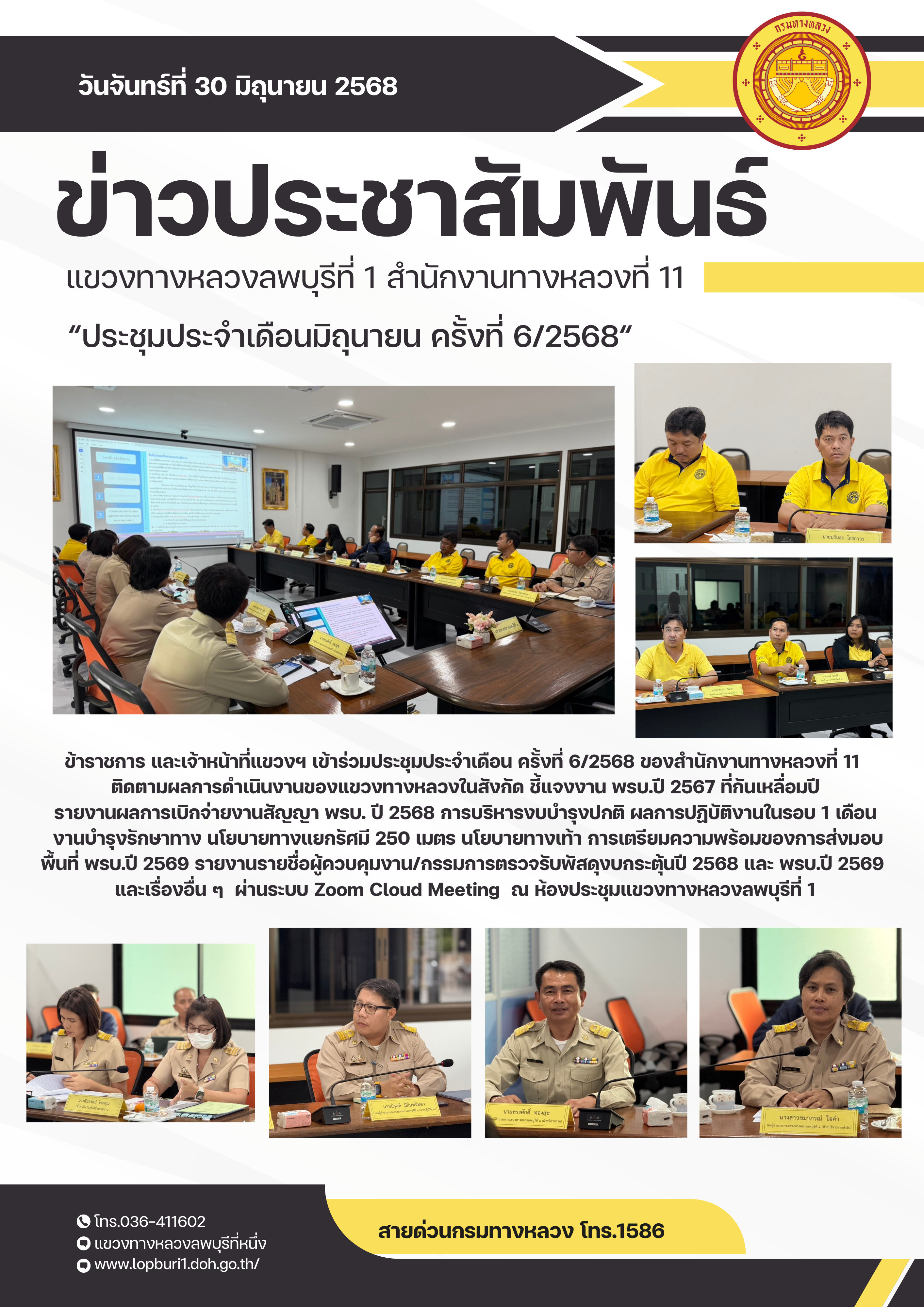 ข้าราชการ และเจ้าหน้าที่แขวงฯ เข้าร่วมประชุมประจำเดือน ครั้งที่ 6/2568 ของสำนักงานทางหลวงที่ 11 ติดตามผลการดำเนินงานของแขวงทางหลวงในสังกัด ชี้แจงงาน พรบ.ปี 2567 ที่กันเหลื่อมปี รายงานผลการเบิกจ่ายงานสัญญา พรบ. ปี 2568 การบริหารงบบำรุงปกติ ผลการปฏิบัติงานในรอบ 1 เดือน งานบำรุงรักษาทาง นโยบายทางแยกรัศมี 250 เมตร นโยบายทางเท้า การเตรียมความพร้อมของการส่งมอบพื้นที่ พรบ.ปี 2569 รายงานรายชื่อผู้ควบคุมงาน/กรรมการตรวจรับพัสดุงบกระตุ้นปี 2568 และ พรบ.ปี 2569 และเรื่องอื่น ๆ ผ่านระบบ Zoom Cloud Meeting ณ ห้องประชุมแขวงทางหลวงลพบุรีที่ 1
