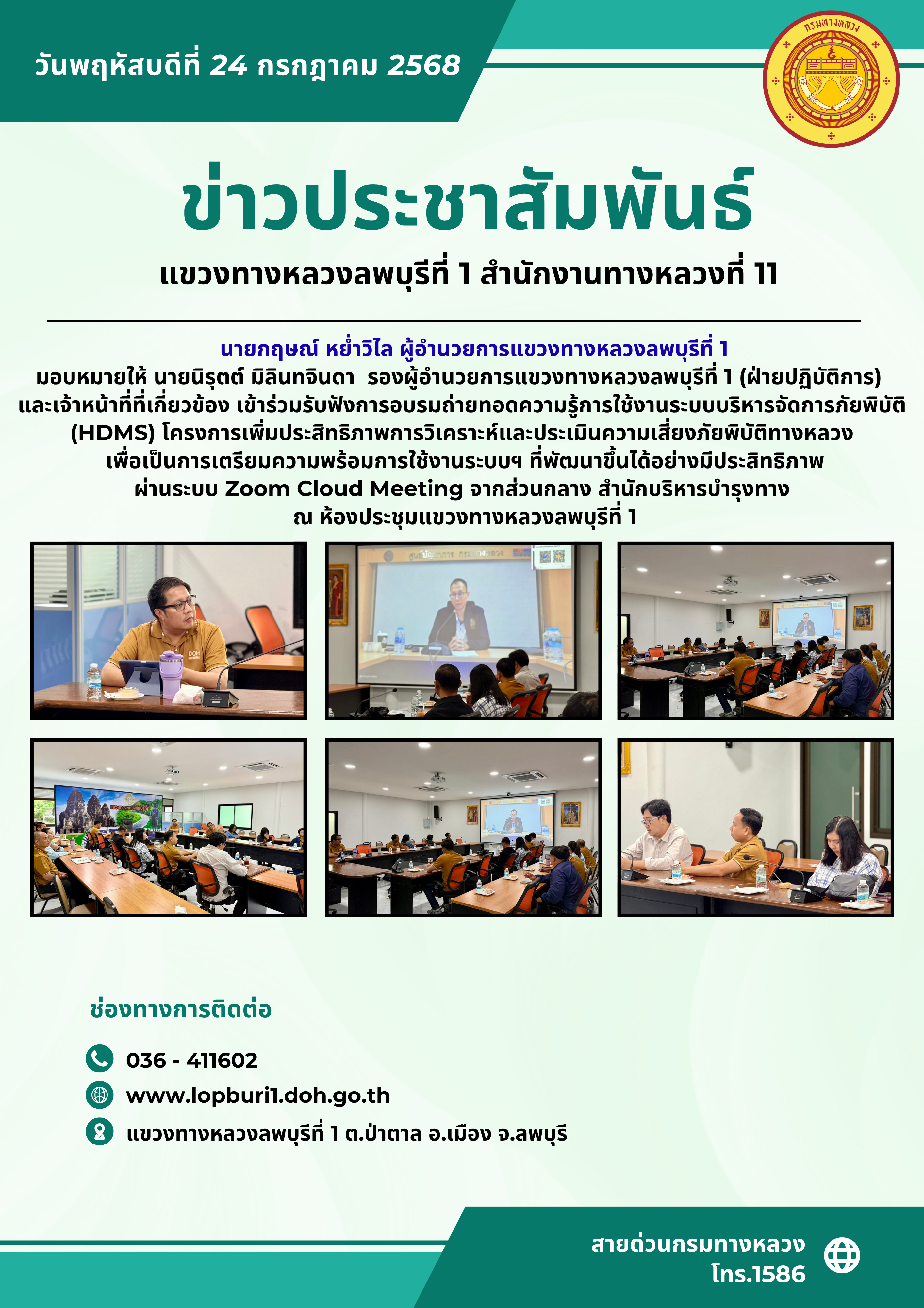 และเจ้าหน้าที่ที่เกี่ยวข้อง เข้าร่วมรับฟังการอบรมถ่ายทอดความรู้การใช้งานระบบบริหารจัดการภัยพิบัติ (HDMS) โครงการเพิ่มประสิทธิภาพการวิเคราะห์และประเมินความเสี่ยงภัยพิบัติทางหลวง