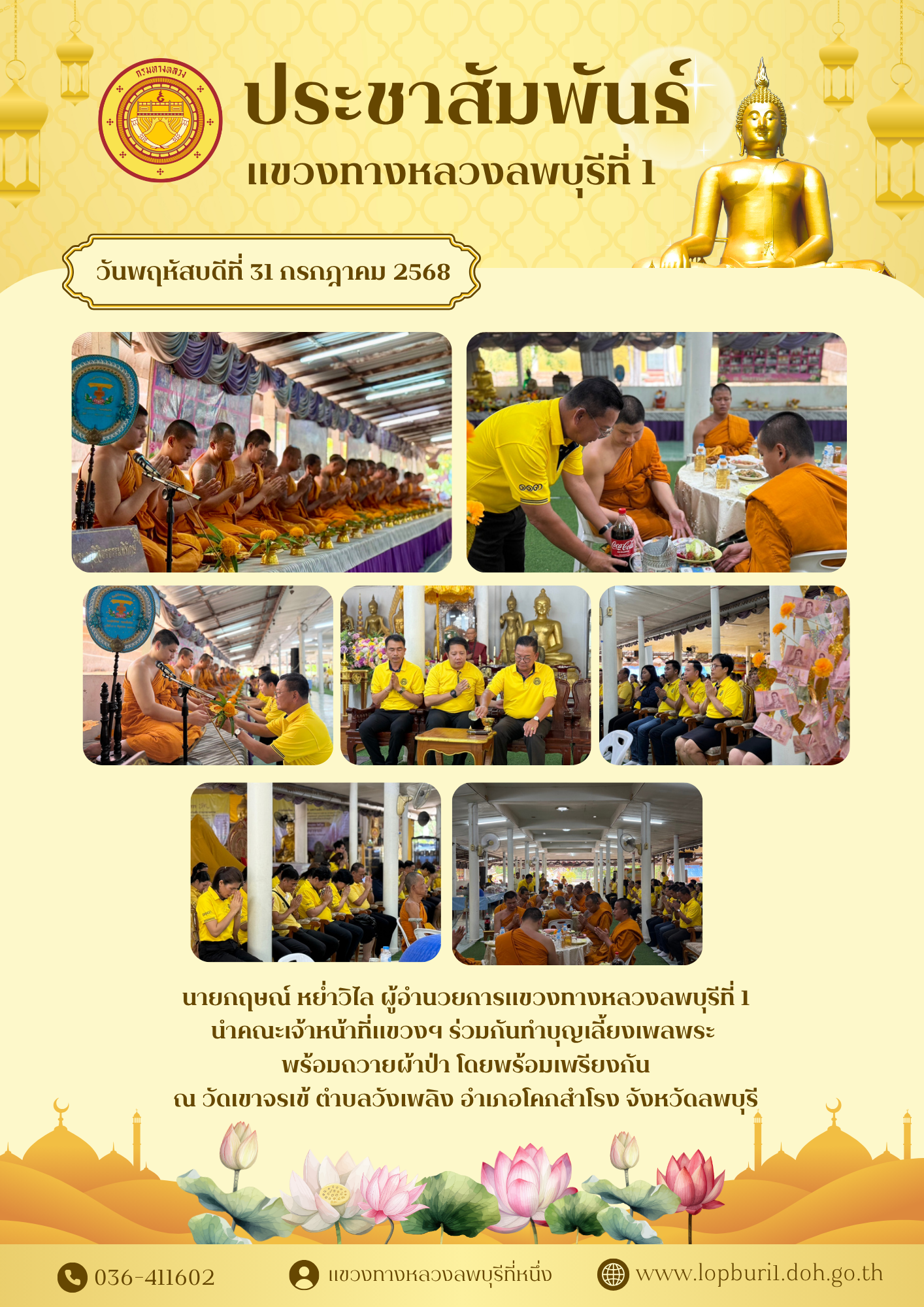 วันพฤหัสบดีที่ 31 กรกฎาคม 2568 นายกฤษณ์ หย่ำวิไล ผู้อำนวยการแขวงทางหลวงลพบุรีที่ 1นำคณะเจ้าหน้าที่แขวงฯ ร่วมกันทำบุญเลี้ยงเพลพระ พร้อมถวายผ้าป่า โดยพร้อมเพรียงกันณ วัดเขาจรเข้ ตำบลวังเพลิง อำเภอโคกสำโรง จังหวัดลพบุรี