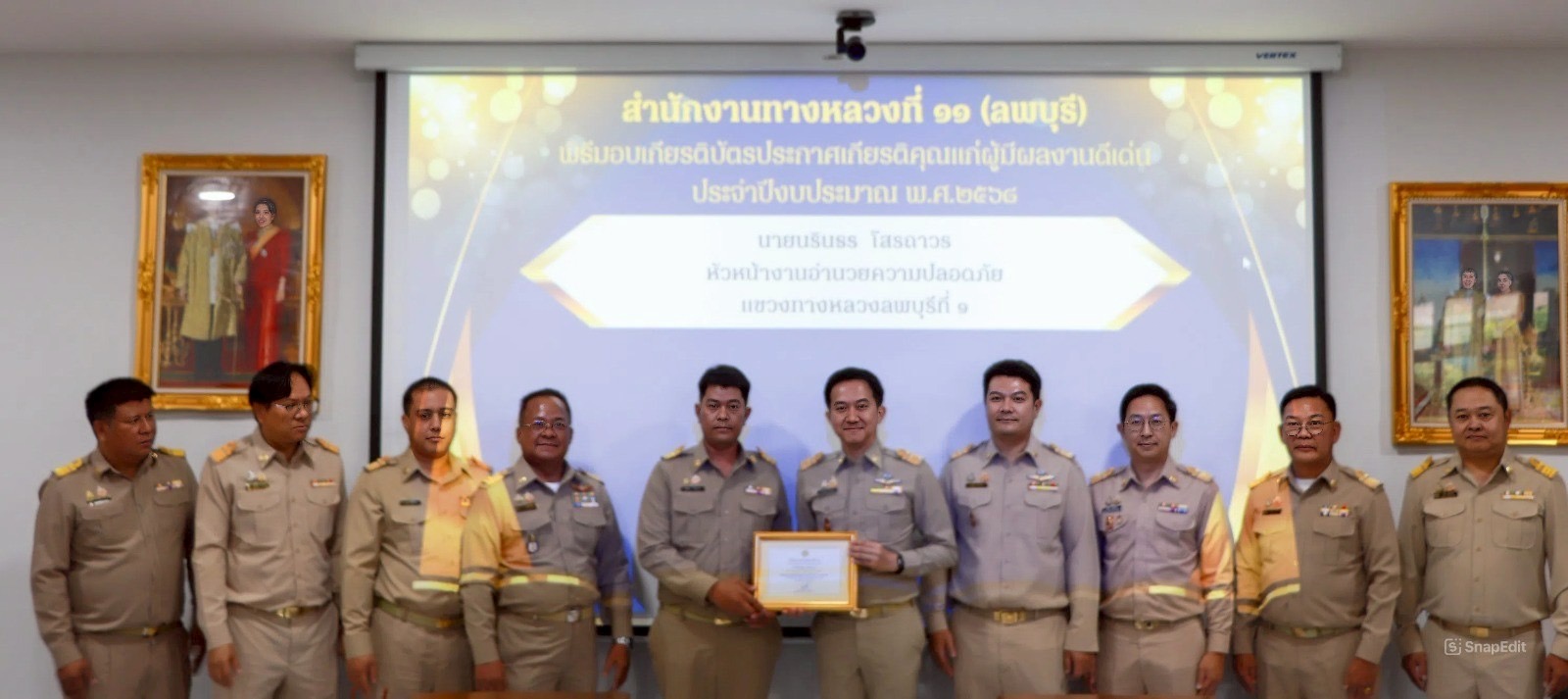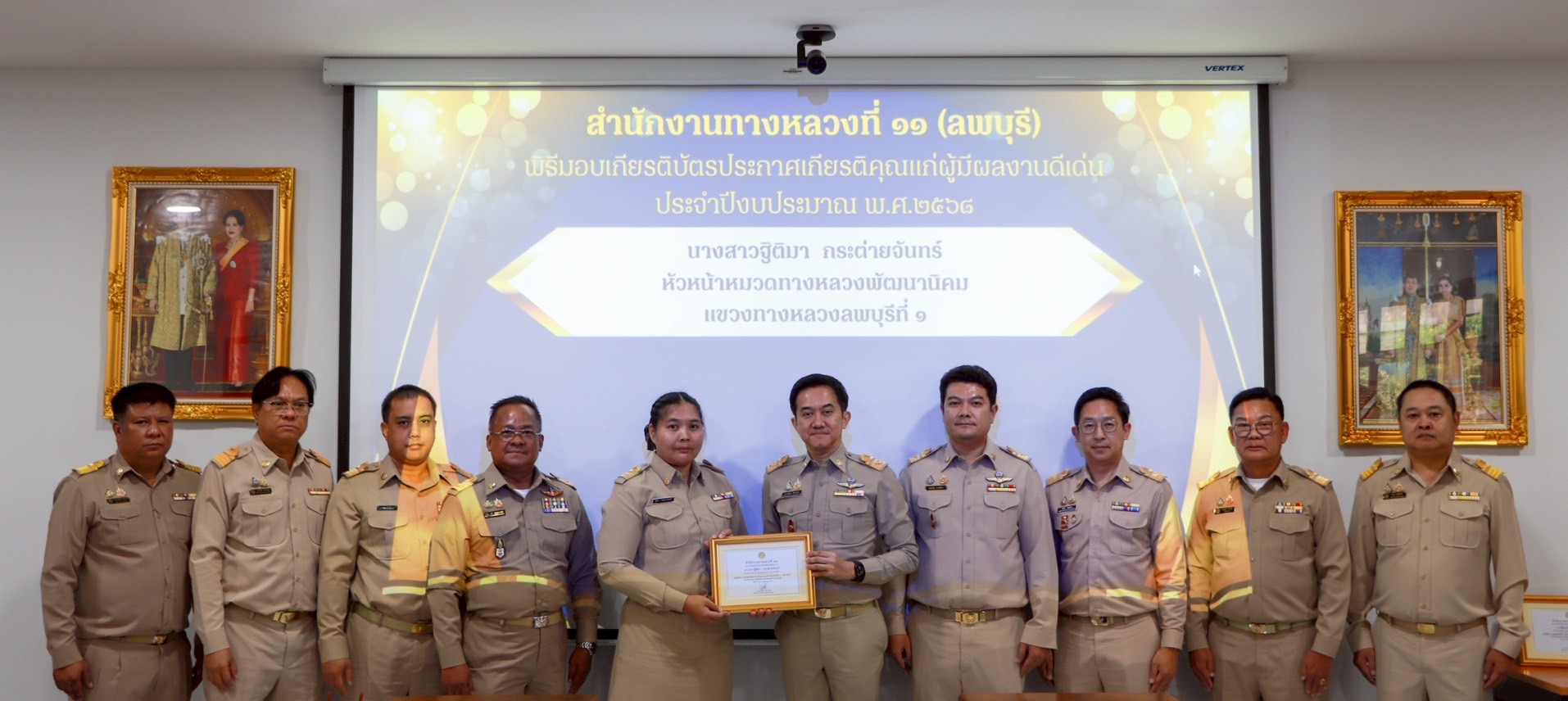 ในการปฏิบัติงาน จาก นายกฤษณ์ หย่ำวิไล ผู้อำนวยการแขวงทางหลวงลพบุรีที่ 1 และมอบเกียรติบัตรประกาศเกียรติคุณแก่ผู้มีผลงานดีเด่นประจำปีงบประมาณ โดยมีรองผู้อำนวยการสำนักงานทางหลวงที่ 11 ตำแหน่งที่ 1 และตำแหน่งที่ 2 ผู้อำนวยการแขวงทางหลวงในสังกัด พร้อมด้วย ผู้อำนวยการส่วนฯ และเจ้าหน้าที่แขวงฯ ลพบุรีที่ 1 เข้าร่วมประชุมโดยพร้อมเพรียงกัน ณ ห้องประชุม อาคาร 113 ปี กรมทางหลวง แขวงทางหลวงลพบุรีที่ 1