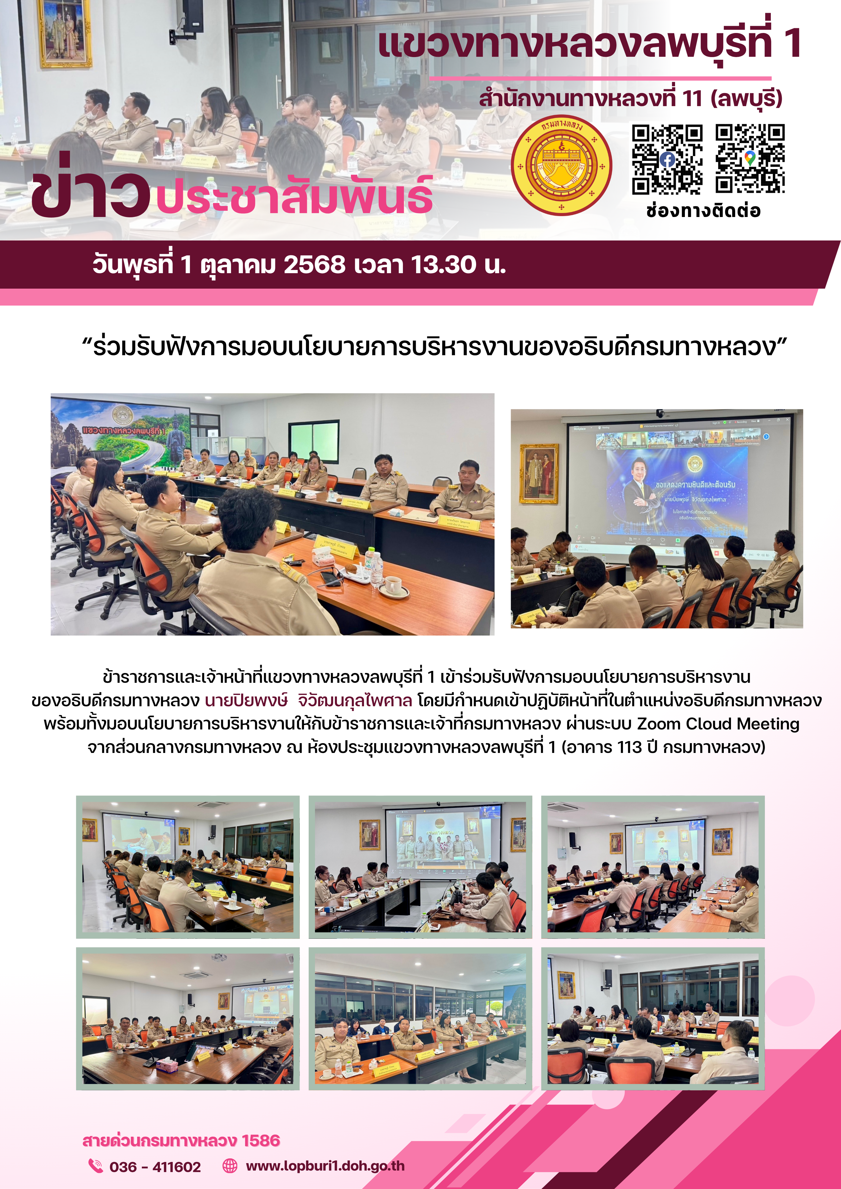 ข้าราชการและเจ้าหน้าที่แขวงทางหลวงลพบุรีที่ 1 เข้าร่วมรับฟังการมอบนโยบายการบริหารงานของอธิบดีกรมทางหลวง นายปิยพงษ์ จิวัฒนกุลไพศาล โดยมีกำหนดเข้าปฏิบัติหน้าที่ในตำแหน่งอธิบดีกรมทางหลวง พร้อมทั้งมอบนโยบายการบริหารงานให้กับข้าราชการและเจ้าที่กรมทางหลวง ผ่านระบบ Zoom Cloud Meeting จากส่วนกลางกรมทางหลวง ณ ห้องประชุมแขวงทางหลวงลพบุรีที่ 1 (อาคาร 113 ปี กรมทางหลวง)