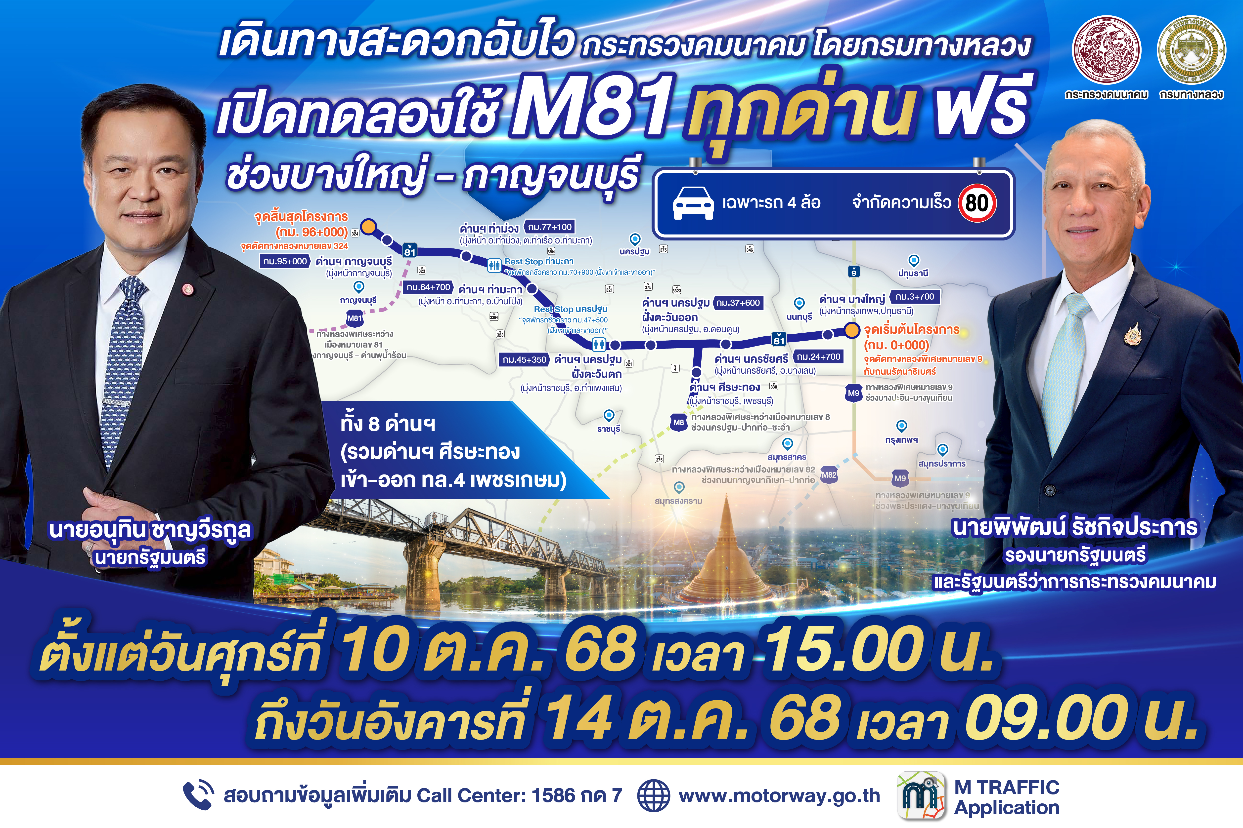 กรมทางหลวง ขานรับนโยบายเร่งด่วนของกระทรวงคมนาคม ภายใต้การกำกับดูแลของ นายพิพัฒน์ รัชกิจประการ รองนายกรัฐมนตรีและรัฐมนตรีว่าการกระทรวงคมนาคม ที่มุ่งยกระดับโครงข่ายคมนาคมของประเทศให้มีความสะดวก ปลอดภัย และช่วยลดภาระค่าใช้จ่ายในการเดินทางของประชาชน ประกาศเปิดทดลองให้บริการทางหลวงพิเศษระหว่างเมืองหมายเลข 81 สายบางใหญ่ – กาญจนบุรี (มอเตอร์เวย์ M81) ตลอดสาย ระยะทาง 96 กิโลเมตร โดยไม่เก็บค่าธรรมเนียมผ่านทาง ระหว่างวันศุกร์ที่ 10 ตุลาคม 2568 เวลา 15.00 น. ถึง วันอังคารที่ 14 ตุลาคม 2568 เวลา 09.00 น. เพื่ออำนวยความสะดวกการเดินทางช่วงวันหยุดยาวเนื่องในวันนวมินทรมหาราช