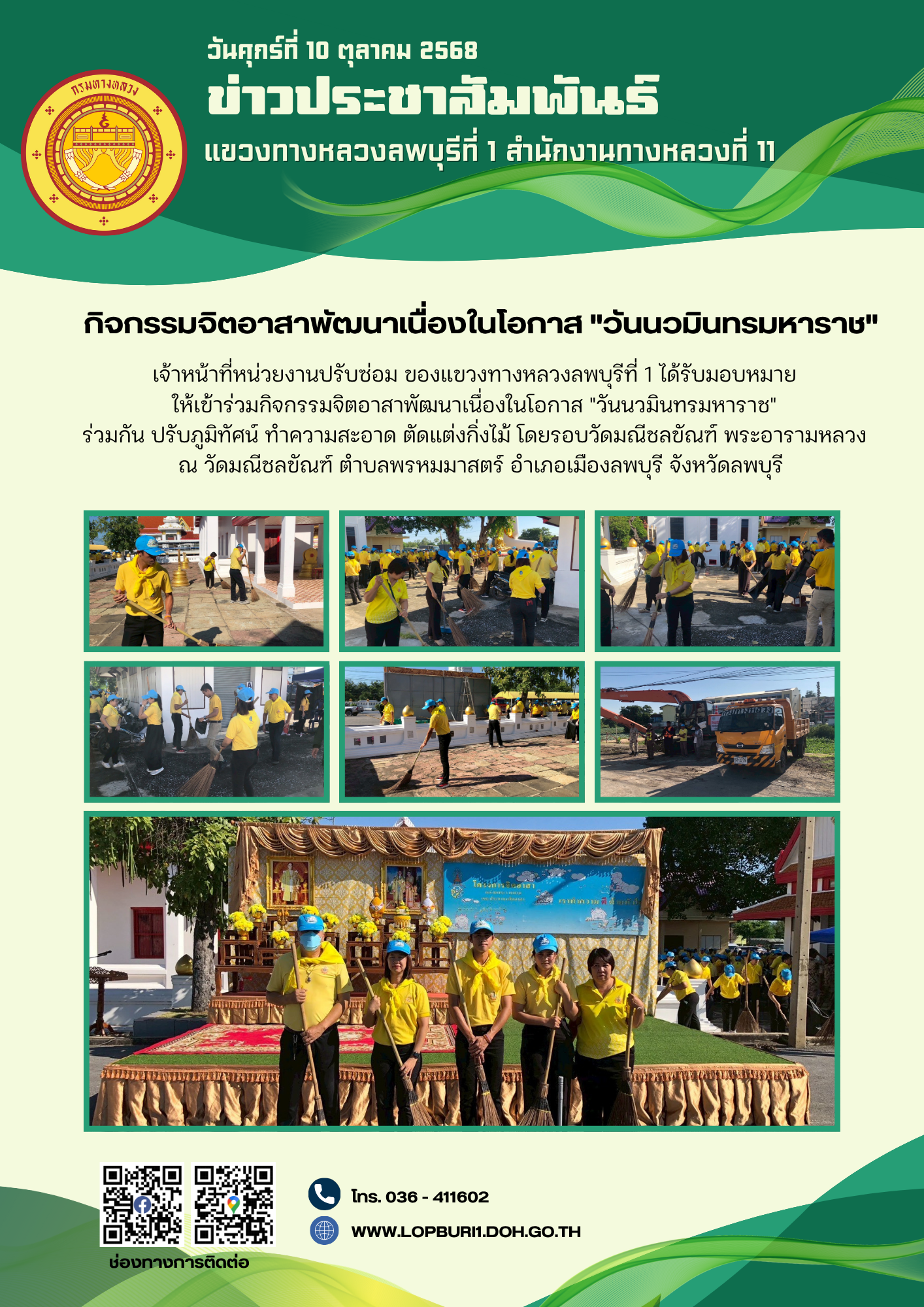 เจ้าหน้าที่หน่วยงานปรับซ่อม ของแขวงทางหลวงลพบุรีที่ 1 ได้รับมอบหมาย ให้เข้าร่วมกิจกรรมจิตอาสาพัฒนาเนื่องในโอกาส "วันนวมินทรมหาราช" ร่วมกัน ปรับภูมิทัศน์ ทำความสะอาด ตัดแต่งกิ่งไม้ โดยรอบวัดมณีชลขัณฑ์ พระอารามหลวง ณ วัดมณีชลขัณฑ์ ตำบลพรหมมาสตร์ อำเภอเมืองลพบุรี จังหวัดลพบุรี