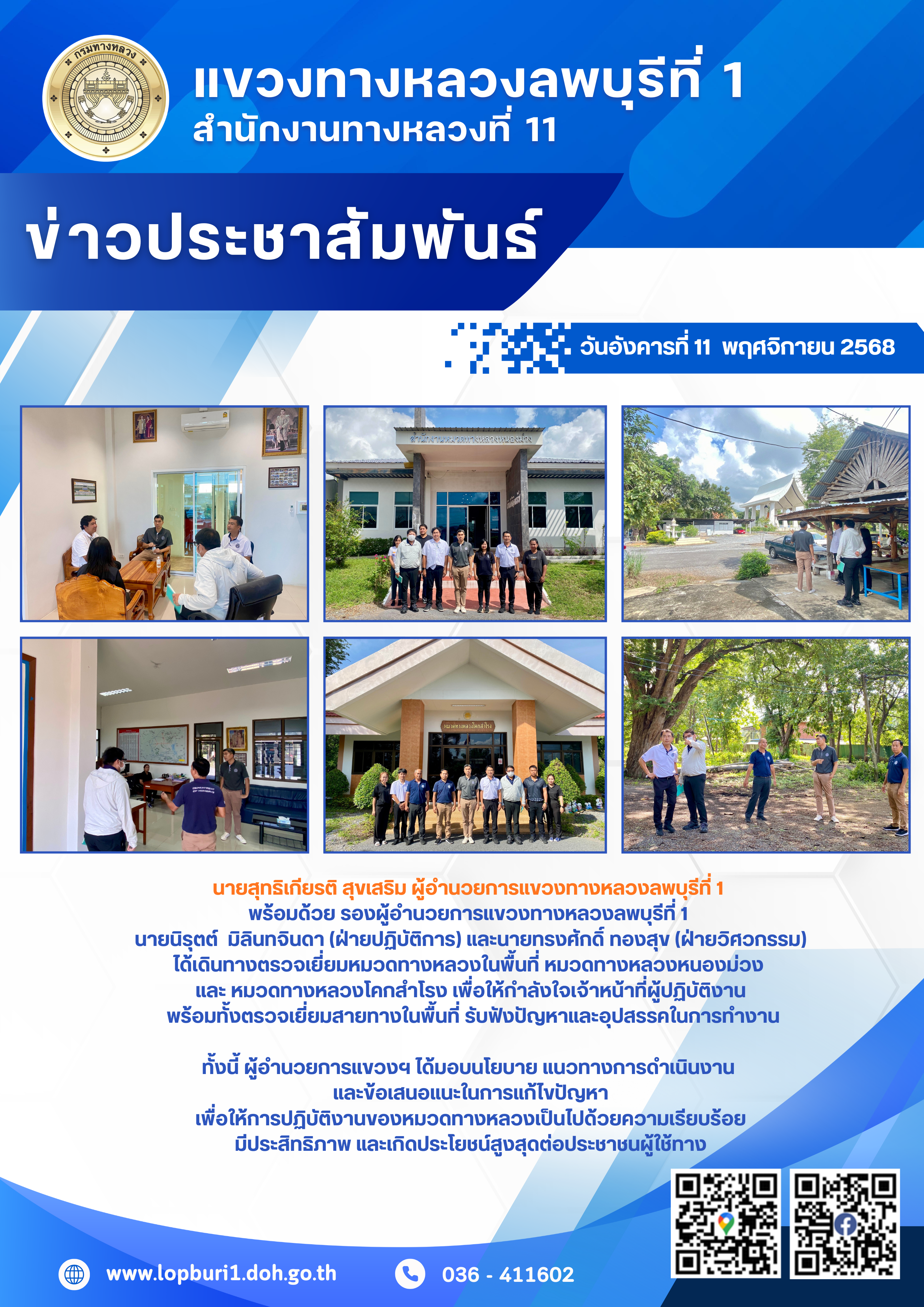 นายสุทธิเกียรติ สุขเสริม ผู้อำนวยการแขวงทางหลวงลพบุรีที่ 1 พร้อมด้วย รองผู้อำนวยการแขวงทางหลวงลพบุรีที่ 1 นายนิรุตต์ มิลินทจินดา (ฝ่ายปฏิบัติการ) และ นายทรงศักดิ์ ทองสุข (ฝ่ายวิศวกรรม)ได้เดินทางตรวจเยี่ยม หมวดทางหลวงหนองม่วง และ หมวดทางหลวงโคกสำโรง เพื่อให้กำลังใจเจ้าหน้าที่ผู้ปฏิบัติงาน พร้อมทั้งตรวจเยี่ยมสายทางในพื้นที่ รับฟังปัญหาและอุปสรรคในการทำงานทั้งนี้ ผู้อำนวยการแขวงฯ ได้มอบนโยบาย แนวทางการดำเนินงาน และข้อเสนอแนะในการแก้ไขปัญหา เพื่อให้การปฏิบัติงานของหมวดทางหลวงเป็นไปด้วยความเรียบร้อย มีประสิทธิภาพ และเกิดประโยชน์สูงสุดต่อประชาชนผู้ใช้ทาง