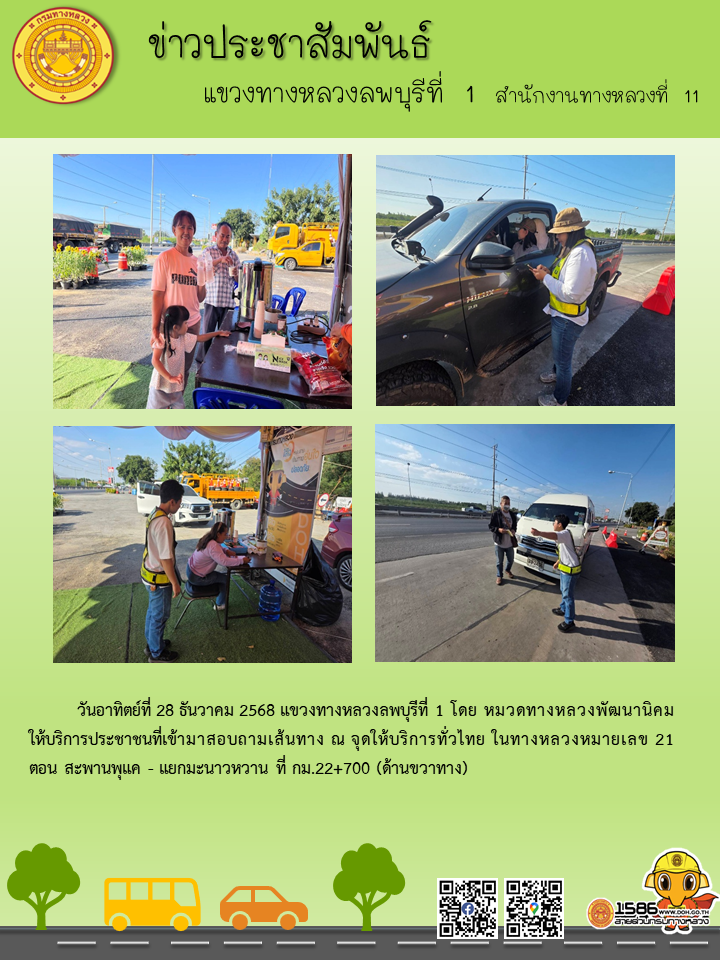 แขวงทางหลวงลพบุรีที่ 1 โดย หมวดทางหลวงพัฒนานิคม ให้บริการประชาชนที่เข้ามาสอบถามเส้นทาง ณ จุดให้บริการทั่วไทย ในทางหลวงหมายเลข 21 ตอน สะพานพุแค - แยกมะนาวหวาน ที่ กม.22+700 (ด้านขวาทาง)