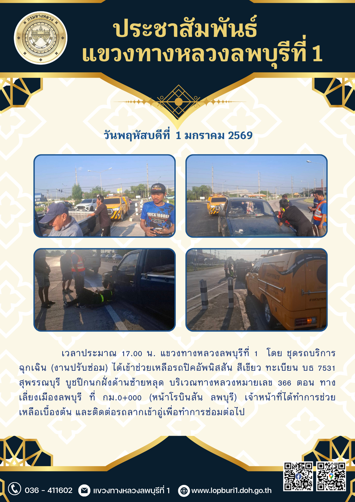 เวลาประมาณ 17.00 น. แขวงทางหลวงลพบุรีที่ 1 โดย ชุดรถบริการฉุกเฉิน (งานปรับซ่อม) ได้เข้าช่วยเหลือรถปิคอัพนิสสัน สีเขียว ทะเบียน บธ 7531 สุพรรณบุรี บูชปีกนกฝั่งด้านซ้ายหลุด บริเวณทางหลวงหมายเลข 366 ตอน ทางเลี่ยงเมืองลพบุรี ที่ กม.0+000 (หน้าโรบินสัน ลพบุรี) เจ้าหน้าที่ได้ทำการช่วยเหลือเบื้องต้น และติดต่อรถลากเข้าอู่เพื่อทำการซ่อมต่อไป