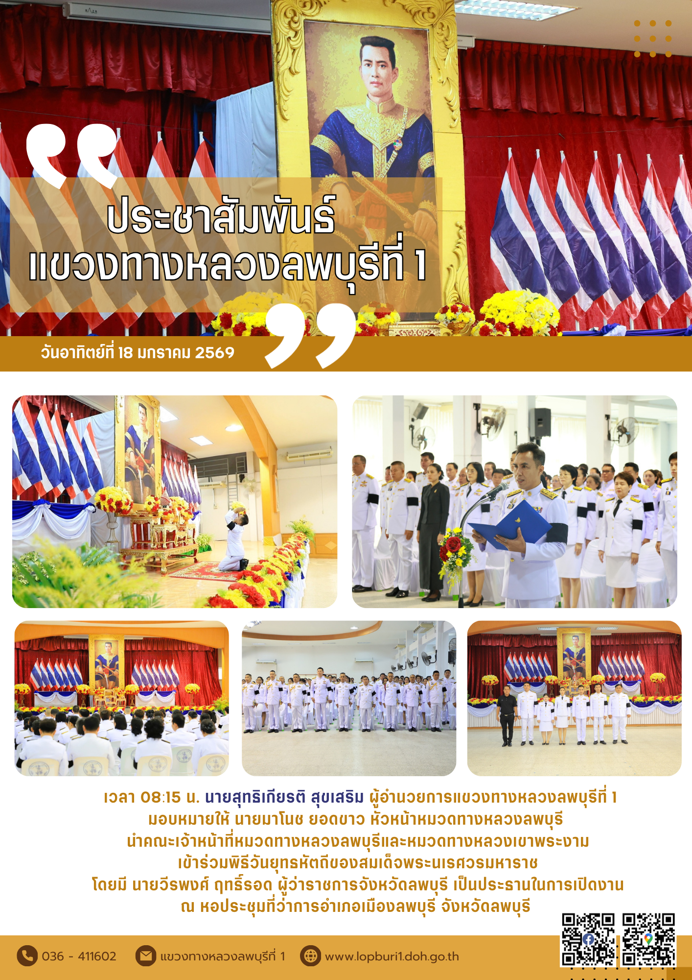 วันอาทิตย์ที่ 18 มกราคม 2569 เวลา 08:15 น. นายสุทธิเกียรติ สุขเสริม ผู้อำนวยการแขวงทางหลวงลพบุรีที่ 1 มอบหมายให้ นายมาโนช ยอดขาว หัวหน้าหมวดทางหลวงลพบุรี