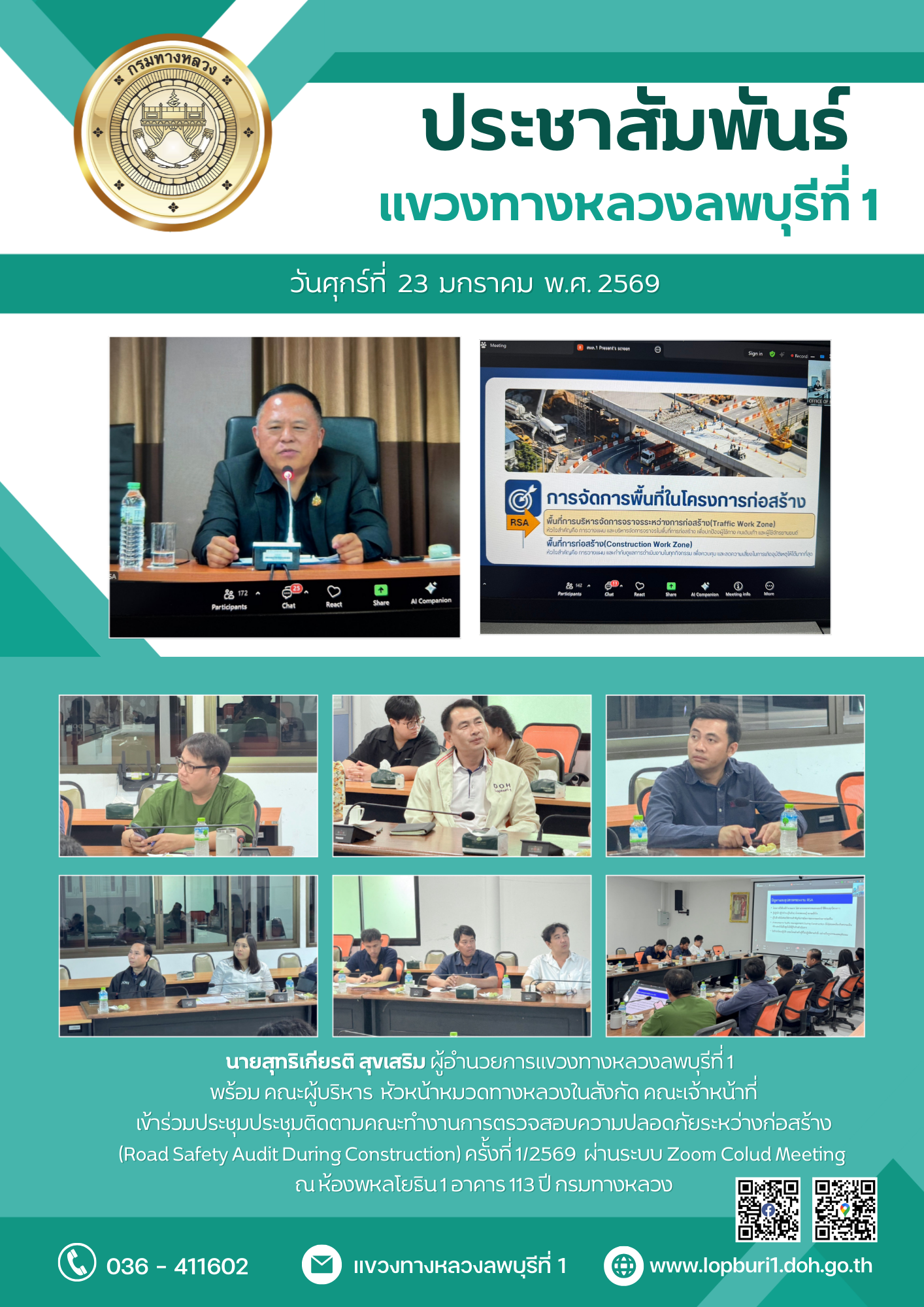 นายสุทธิเกียรติ สุขเสริม ผู้อำนวยการแขวงทางหลวงลพบุรีที่ 1 พร้อม คณะผู้บริหาร หัวหน้าหมวดทางหลวงในสังกัด และเจ้าหน้าที่แขวงทางหลวงลพบุรีที่ 1 เข้าร่วมประชุมประชุมติดตามคณะทำงานการตรวจสอบความปลอดภัยระหว่างก่อสร้าง (Road Safety Audit During Construction) ครั้งที่ 1/2569 ผ่านระบบ Zoom Colud Meeting ณ ห้องพหลโยธิน 1 อาคาร 113 ปี กรมทางหลวง