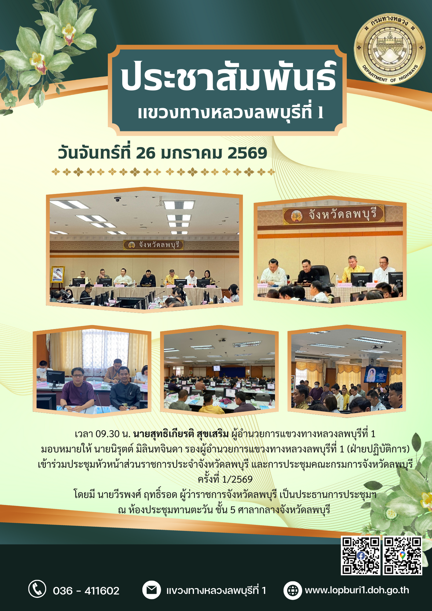 เวลา 09.30 น. นายสุทธิเกียรติ สุขเสริม ผู้อำนวยการแขวงทางหลวงลพบุรีที่ 1 มอบหมายให้ นายนิรุตต์ มิลินทจินดา รองผู้อำนวยการแขวงทางหลวงลพบุรีที่ 1 (ฝ่ายปฏิบัติการ) เข้าร่วมประชุมหัวหน้าส่วนราชการประจำจังหวัดลพบุรี และการประชุมคณะกรมการจังหวัดลพบุรี ครั้งที่ 1/2569 โดยมี นายวีรพงศ์ ฤทธิ์รอด ผู้ว่าราชการจังหวัดลพบุรี เป็นประธานการประชุมฯ ณ ห้องประชุมทานตะวัน ชั้น 5 ศาลากลางจังหวัดลพบุรี