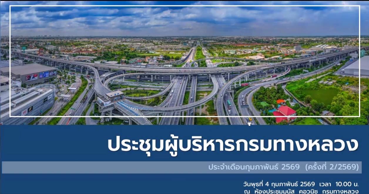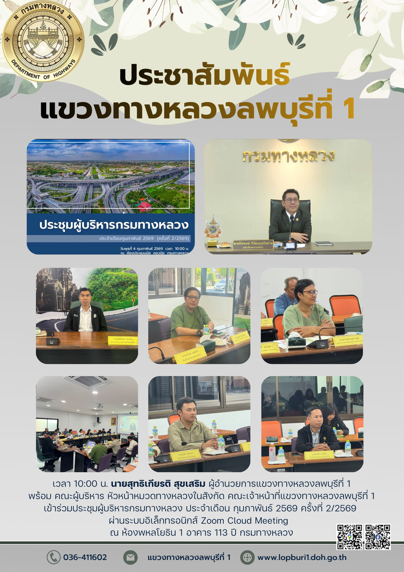 เวลา 10:00 น. นายสุทธิเกียรติ สุขเสริม ผู้อำนวยการแขวงทางหลวงลพบุรีที่ 1 พร้อม คณะผู้บริหาร หัวหน้าหมวดทางหลวงในสังกัด คณะเจ้าหน้าที่แขวงทางหลวงลพบุรีที่ 1 เข้าร่วมประชุมผู้บริหารกรมทางหลวง ประจำเดือน กุมภาพันธ์ 2569 ครั้งที่ 2/2569 ผ่านระบบอิเล็กทรอนิกส์ Zoom Cloud Meeting ณ ห้องพหลโยธิน 1 อาคาร 113 ปี กรมทางหลวง