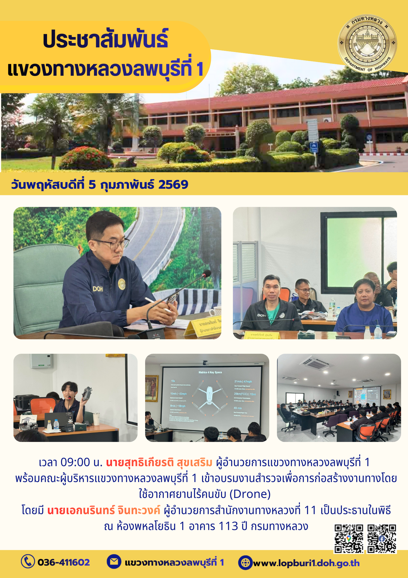 เวลา 09:00 น. นายสุทธิเกียรติ สุขเสริม ผู้อำนวยการแขวงทางหลวงลพบุรีที่ 1 พร้อมคณะผู้บริหารแขวงทางหลวงลพบุรีที่ 1 เข้าอบรมงานสำรวจเพื่อการก่อสร้างงานทางโดยใช้อากาศยานไร้คนขับ (Drone) โดยมี นายเอกนรินทร์ จินทะวงค์ ผู้อำนวยการสำนักงานทางหลวงที่ 11 เป็นประธานในพิธี ณ ห้องพหลโยธิน 1 อาคาร 113 ปี กรมทางหลวง