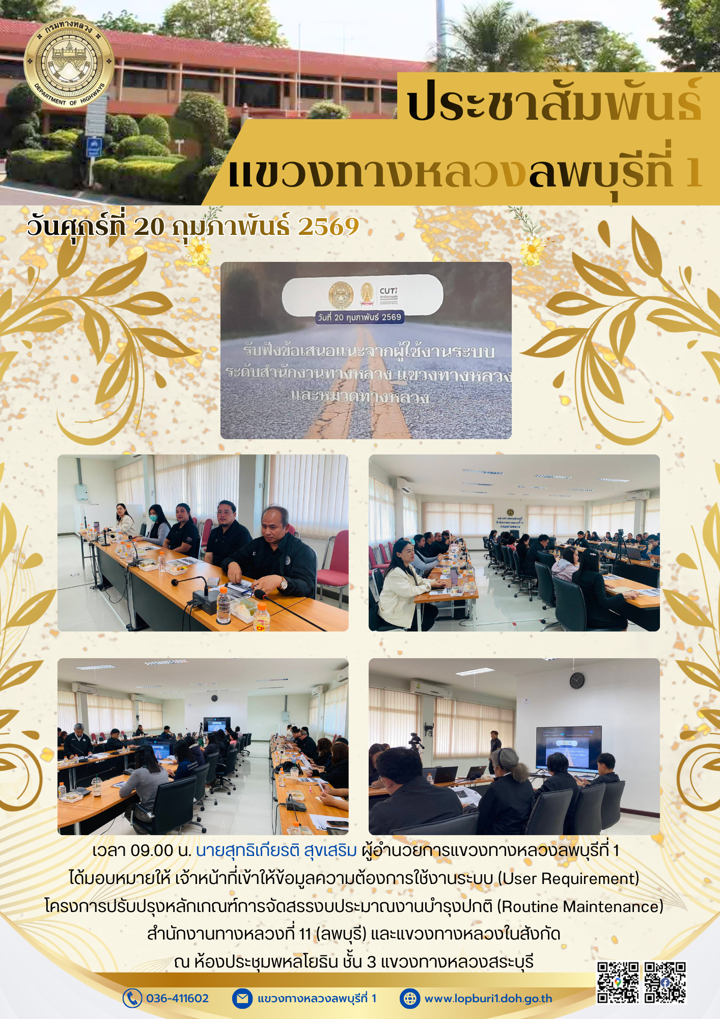 เวลา 10.00 น. นายสุทธิเกียรติ สุขเสริม ผู้อำนวยการแขวงทางหลวงลพบุรีที่ 1 ได้มอบหมายให้ เจ้าหน้าที่เข้าให้ข้อมูลความต้องการใช้งานระบบ (User Requirement) โครงการปรับปรุงหลักเกณฑ์การจัดสรรงบประมาณงานบำรุงปกติ (Routine Maintenance) สำนักงานทางหลวงที่ 11 (ลพบุรี) และแขวงทางหลวงในสังกัด ณ ห้องประชุมพหลโยธิน ชั้น 3 แขวงทางหลวงสระบุรี