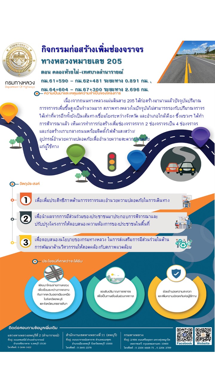 ประชาสัมพันธ์เชิญเข้าร่วมประชุมรับฟังความคิดเห็นของประชาชนจกรรมก่อสร้างเพิ่มประสิทธิภาพทางหลวง – กิจกรรมเพิ่มช่องจราจร ทางหลวงหมายเลข 205 ตอน คลองห้วยไผ่ – เทศบาลลำนารายณ์ ระหว่าง กม.61+590 – กม.62+481 ระยะทาง 0.891 กิโลเมตร และระหว่าง กม.64+604 – กม.67+300 ระยะทาง 2.696 กิโลเมตร