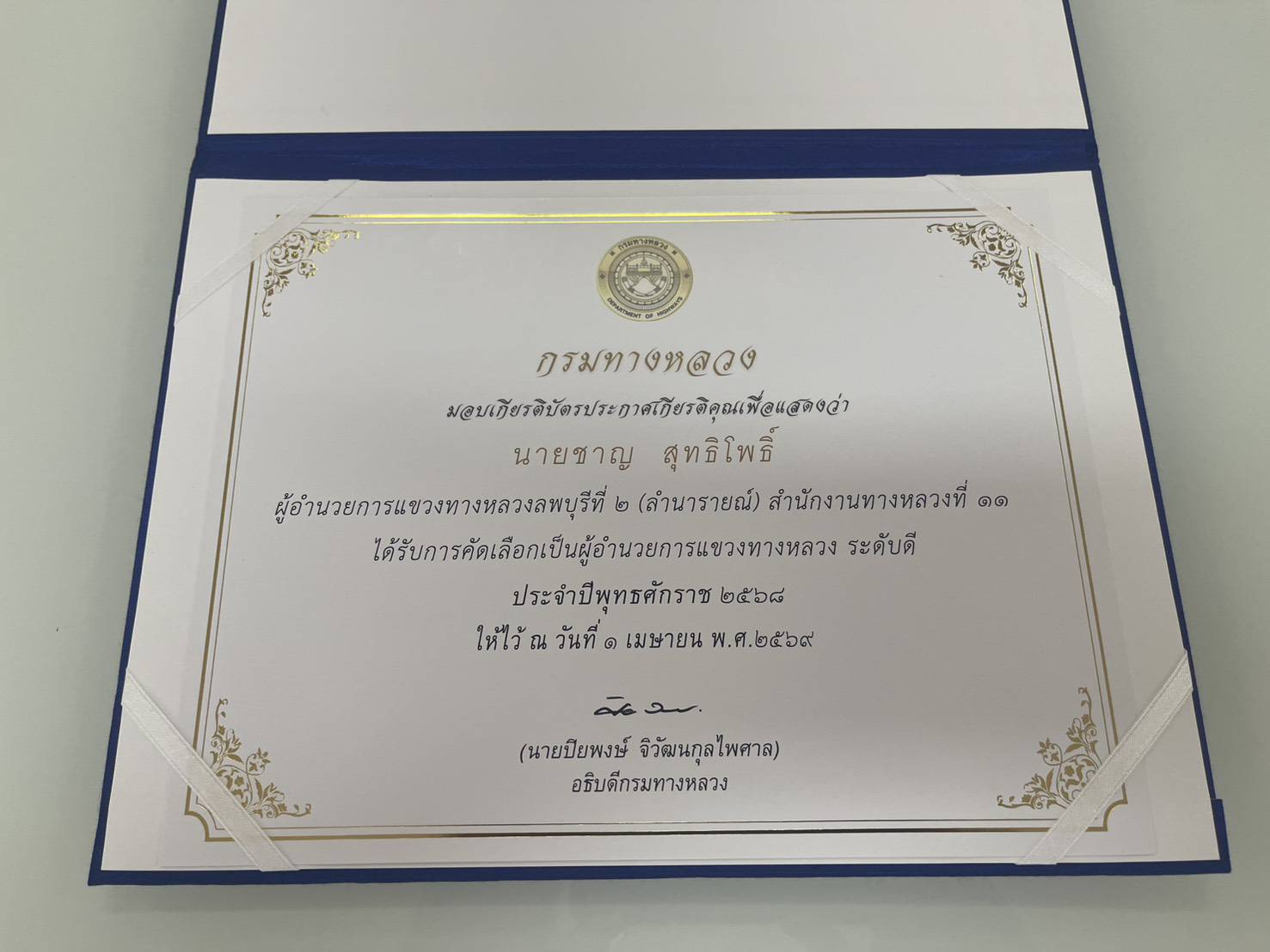 ผู้อำนวยการแขวงทางหลวงลพบุรีที่ 2 (ลำนารายณ์) รับรางวัลผู้อำนวยการแขวงทางหลวงระดับดี ประจำปีงบประมาณ พ.ศ. 2568