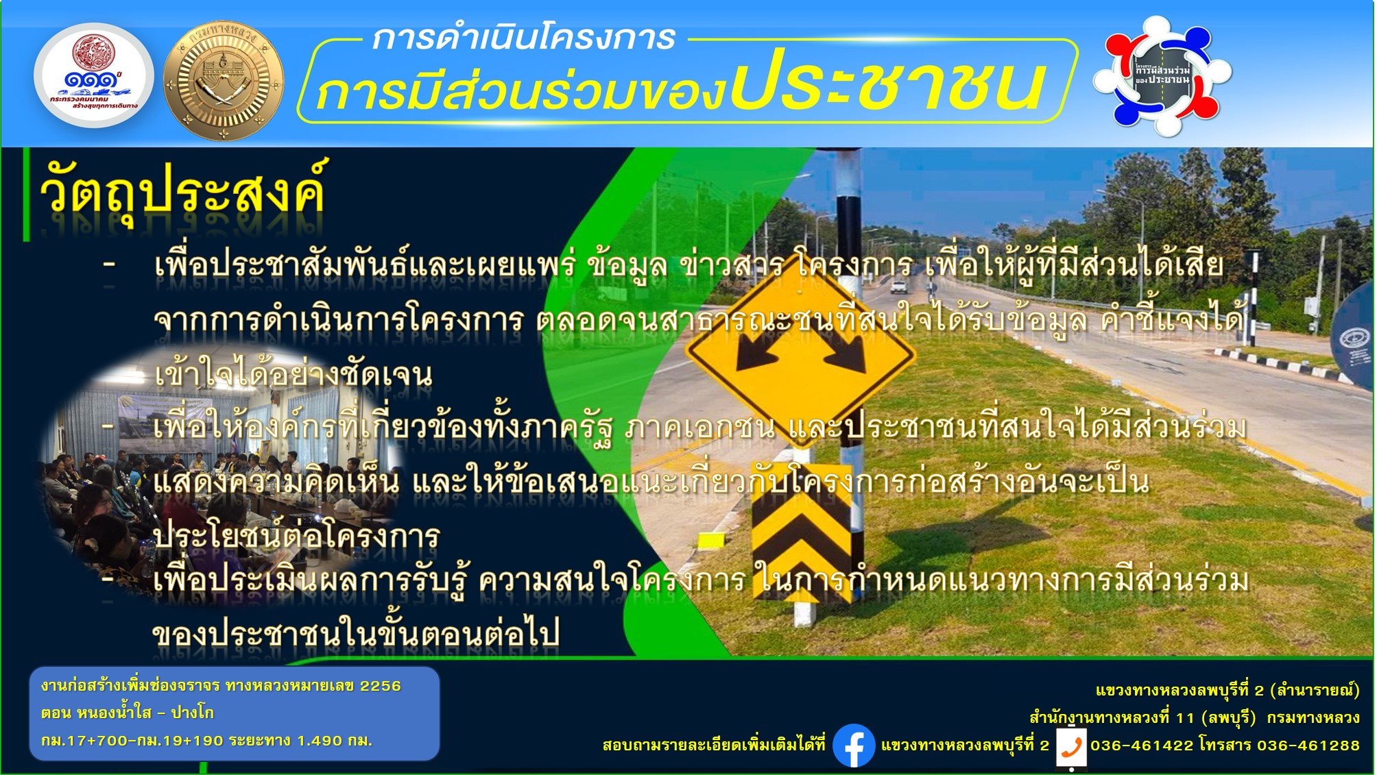 แขวงทางหลวงลพบุรีที่ 2 (ลำนารายณ์) กรมทางหลวง จึงเรียนเชิญผู้ที่สนใจ เข้าร่วมประชุมรับฟังการบรรยายพร้อมแสดงความคิดเห็น และร่วมแลกเปลี่ยนนข้อมูลข่าวสารต่าง ในวันศุกร์ที่ 15 มีนาคม 2567 เวลา 09.00 น - 12.00 น. ณ ห้องประชุมโรงเรียนท่าหลวงวิทยาคม ตำบลซับจำปา อำเภอท่าหลวง จังหวัดลพบุรี