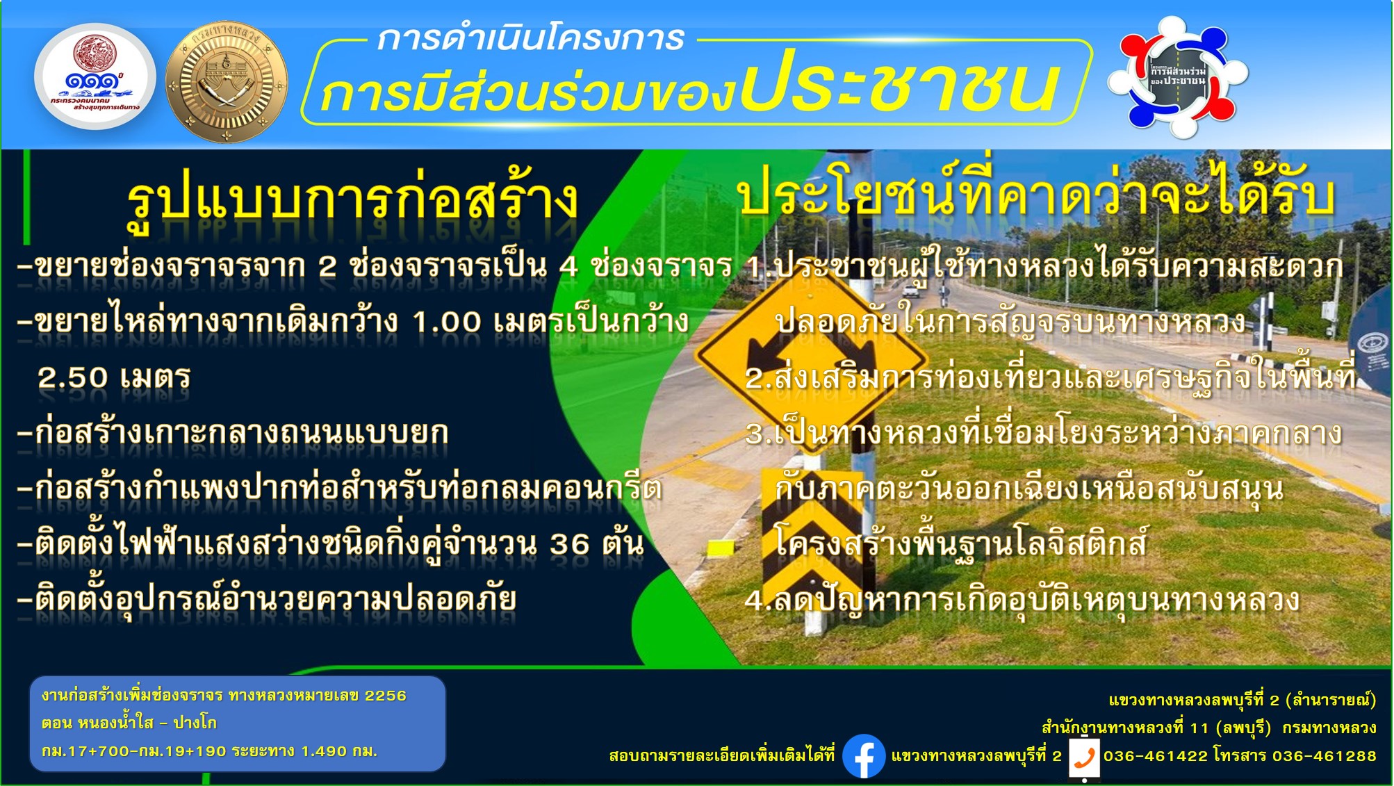 ด้วยแขวงทางหลวงลพบุรีที่ 2 (ลำนารายณ์) กรมทางหลวง ได้รับจัดสรรงบประมาณปี 2567 กิจกรรมก่อสร้างเพิ่มช่องจราจร ทางหลวงหมายเลข 2256 ตอน หนองน้ำใส - ปางโก กม.17+700 - กม.19+190 ระยะทาง 1.490 กม. โดยจะทำการขยายช่องจราจรจาก 2 ช่องจราจร เป็น 4 ช่องจราจร และทำการก่อสร้างเกาะกลางถนนพร้อมติดตั้งไฟฟ้าแสงสว่าง/อุปกรณ์อำนวยความปลอดภัย เพื่อเพิ่มประสิทธิภาพในการรองรับประมาณจราจรที่เพิ่มมากขึ้น และเพื่ออำนวยความสะดวกปลอดภัยแก่ผู้ใช้ทางหลวง
