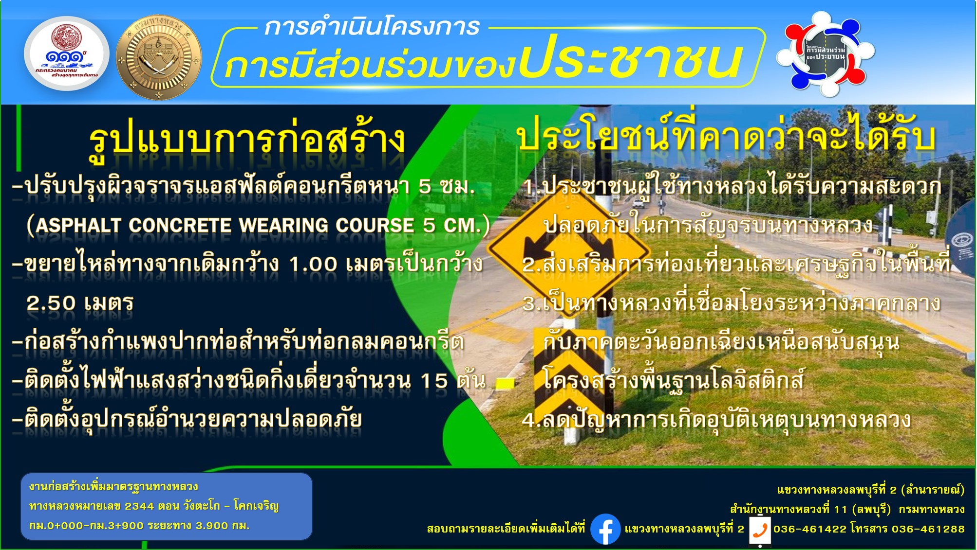 ด้วยแขวงทางหลวงลพบุรีที่ 2 (ลำนารายณ์) กรมทางหลวง ได้รับจัดสรรงบประมาณปี 2567 กิจกรรมก่อสร้างเพิ่มมาตรฐานทางหลวง ทางหลวงหมายเลข 2344 ตอน วังตะโก - โคกเจริญ กม.0+000 - กม.3+900 ระยะทาง 3.900 กม. โดยจะทำการปรับปรุงผิวทางและไหล่ทางจากมาตรฐานทางชั้น 7/(9) เป็นมาตรฐานทาง 7/(12) ซึ่งจะดำเนินการปรับปรุงผิวจราจรและขยายไหล่ทางจากความกว้างเดิม 1.00 ม.เป็นความกว้าง 2.50 ม. พร้อมติดตั้งอุปกรณ์อำนวยความปลอดภัย เพื่อเพิ่มประสิทธิภาพในการรองรับประมาณจราจรที่เพิ่มมากขึ้น และเพื่ออำนวยความสะดวกปลอดภัยแก่ผู้ใช้ทางหลวง