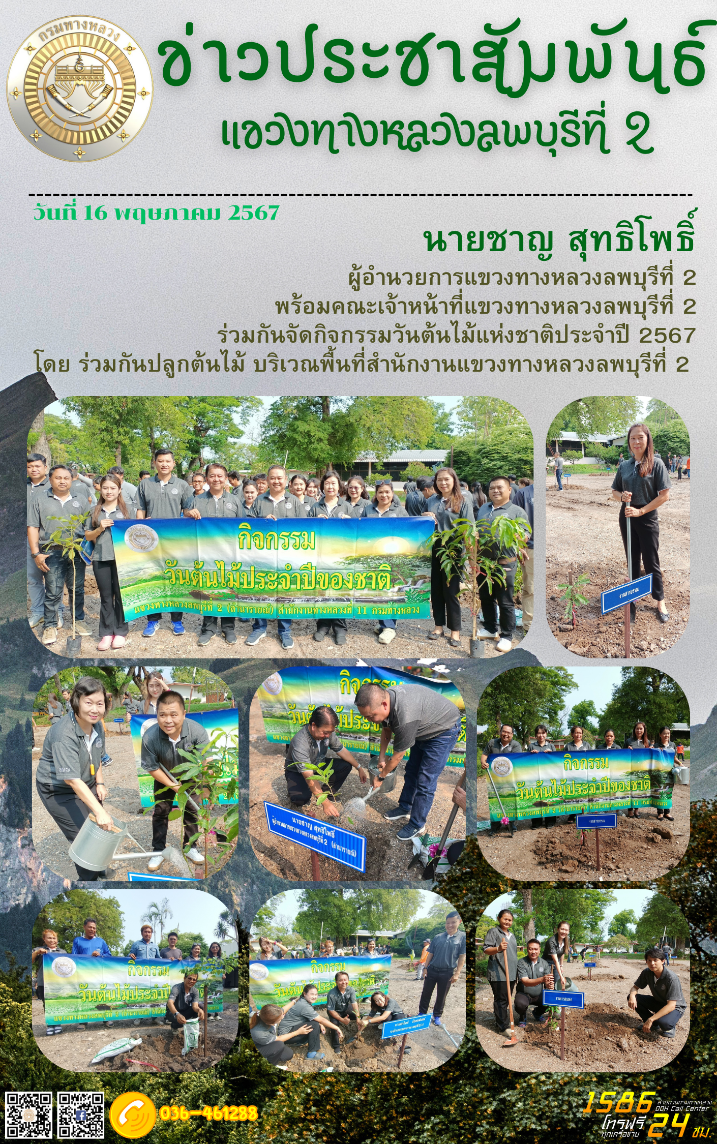 วันที่ 16 พฤษภาคม 2567 เวลา 09.00 น. นายชาญ สุทธิโพธิ์ ผู้อำนวยการแขวงทางหลวงลพบุรีที่ 2 พร้อมคณะเจ้าหน้าที่แขวงทางหลวงลพบุรีที่ 2 ร่วมกันจัดกิจกรรมวันต้นไม้ประจำปีของชาติ พ.ศ.2567 โดยร่วมกันปลูกต้นไม้ บริเวณพื้นที่ สำนักงานแขวงทางหลวงลพบุรีที่ 2